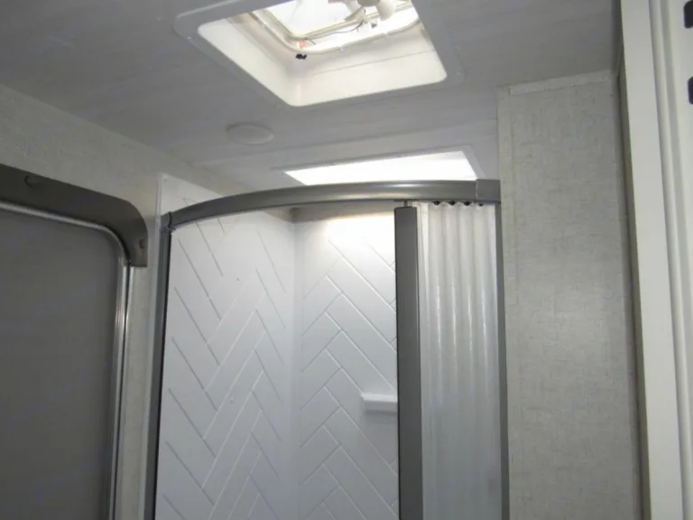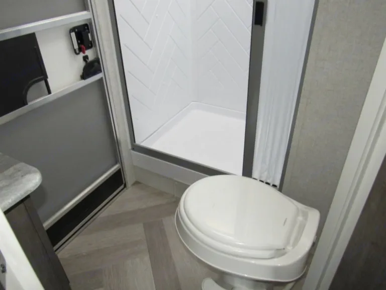 A/C and heat. Outdoor flat-top grill and mini-fridge, outdoor shower, power awning with lights, BT speakers, BT exterior speakers, even a place to connect the TV on the patio! Pass Thru Storage. Upgraded entry stairs with handrail. Batteries and propane tanks, power jacks, power tongue hitch, and so much more! Are you