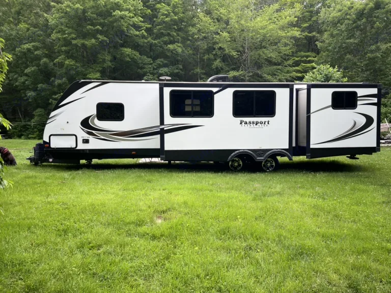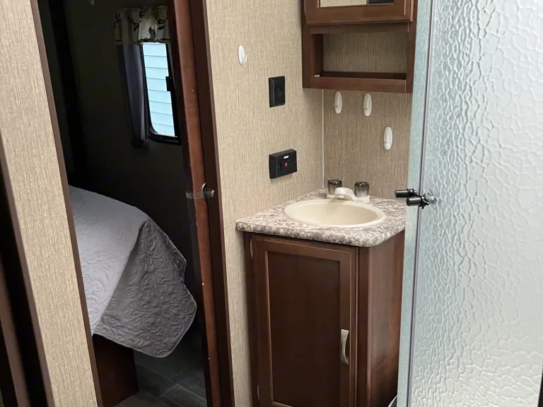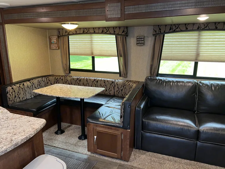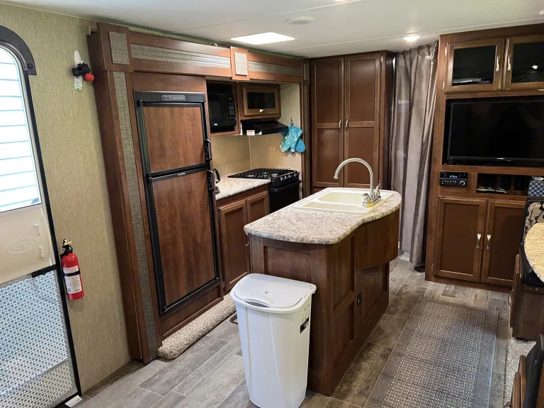 Enjoy the outdoors with a complete kitchen setup, awning, and stereo speakers.
