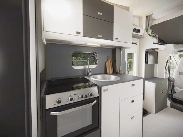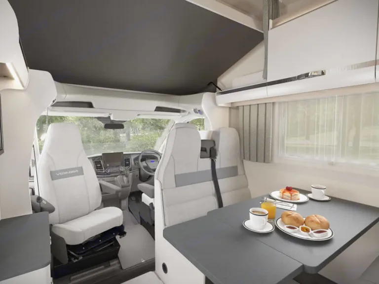 The Swift Voyager 485 is the perfect family motorhome to hire. Its clean lines and up date date decor makes it a fantastic place to be when relaxing after a long day enjoying your holiday.Although officially this motorhome sleeps 6 people, there are 5 seatbelts for travelling.To the front of this motorhome we have an over cab double bed which raises during the day for head space. Underneath this you will find a day lounge for up to 5 people to sit rather comfortably and can be used for socialising and eating. This lounge also converts into a very small double for the evening if there are more than 4 of you travelling.Mid way through the motorhome we have the kitchen galley which boasts a fridge with small freezer compartment, sink, hob and oven/grill. Your kitchen will come fully stocked with all the essentials required to cook the perfect breakfast.Opposite the kitchen you will find a well designed bathroom which has a sink, toilet and shower in. On board you will find this motorhome has heating and hot water so you will not have any problems with keeping warm during those colder evenings.At the rear of this campervan hire you will find twin beds that turn into a double with plenty of head space.This particular motorhome is based on the Ford Transit with a manual gearbox.