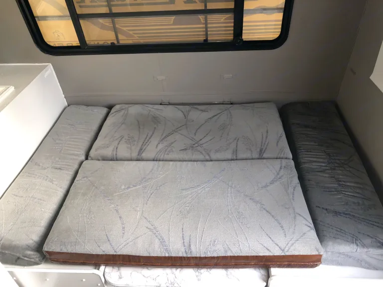 Sleep arrangement (sleeps 4-6): full size futon/sleeper, two bunks, and dining area converts to twin size bed. Fresh water, black and grey water tanks.