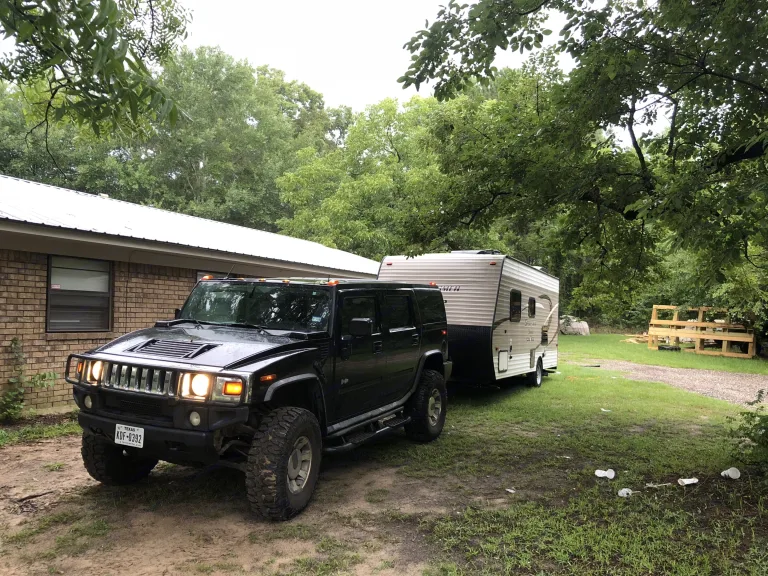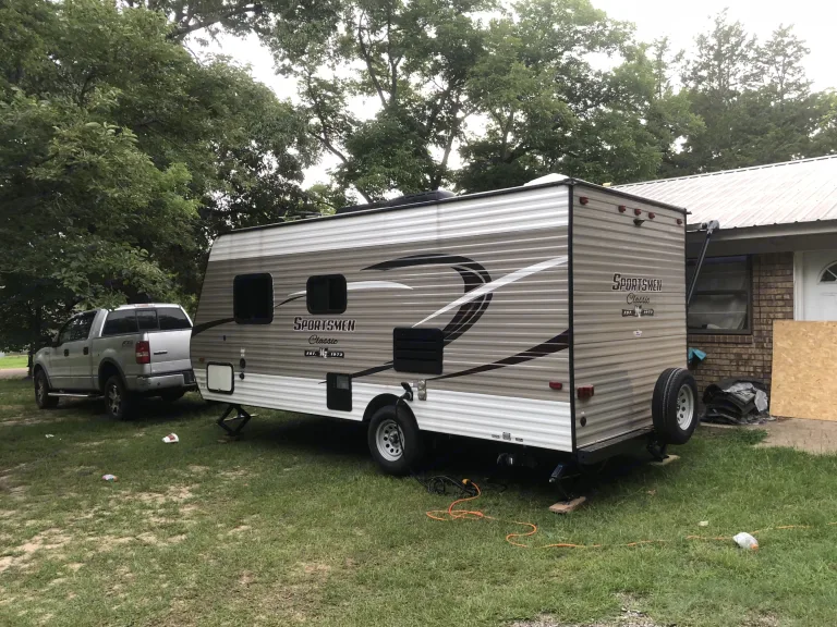 Relaxing easy set up. Has full kitchen, bathroom, and 2 beds. Features inside and outside speakers. Has canopy with lights on the outside.