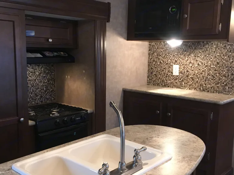 Nice spacious kitchen with an island. As well as a larger than your average trailer couch. It fits 3 adults comfortably. Makes those rainy days a bit more bareable if you choose to stay inside.