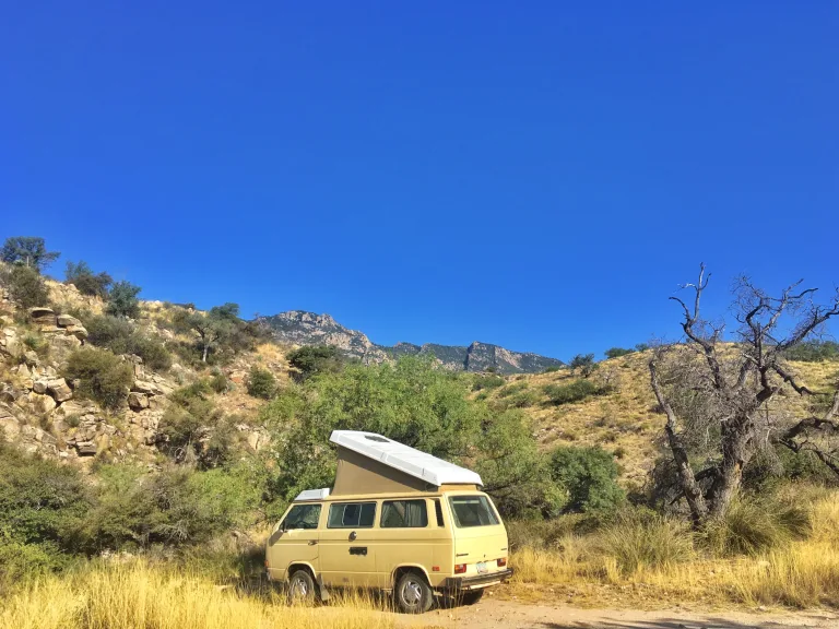 Griz is a gorgeous classic 1984 campervan. Griz sports a 2-burner cookstove, a sink, a 1.7 cubic foot refrigerator, and two beds that sleep up to 4 total. If you want to travel with a small footprint, have a blast, and look cool doing it, Griz your ride.Griz comes with four plates, four bowls, four coffee mugs, and four sets of cutlery, one stock pot, one frying pan, and a french press - because campers deserve coffee. Also included is a serving spoon, spatula, mini-cutting board, paring knife, and whisk.To keep Eileen in tip-top shape, we charge $0.35 per mile for anything over 120 miles per day. This is averaged out over the length of your rental. (Example: If you rent the van 10 days, you would be charged $0.35 per mile for anything over 1,200 miles).