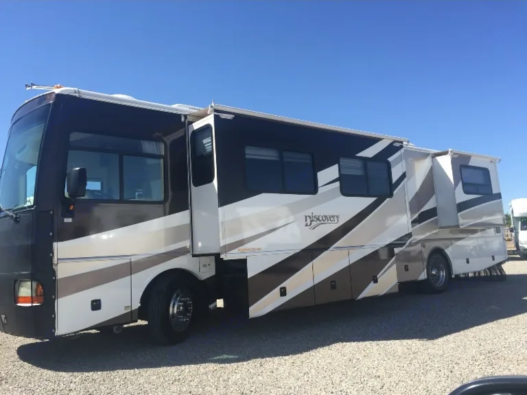 39’ Fleetwood Discovery Diesel Pusher, 3 slide outs, 330hp Caterpillar Engine, diesel generator, 2 air conditioners, 2 full size leather couches, Booth dinetter, 4 door fridge freezer with ice maker, electric awnings, leveling jacks, in motion satellite direct tv with front and rear tvs, backup camera with audio