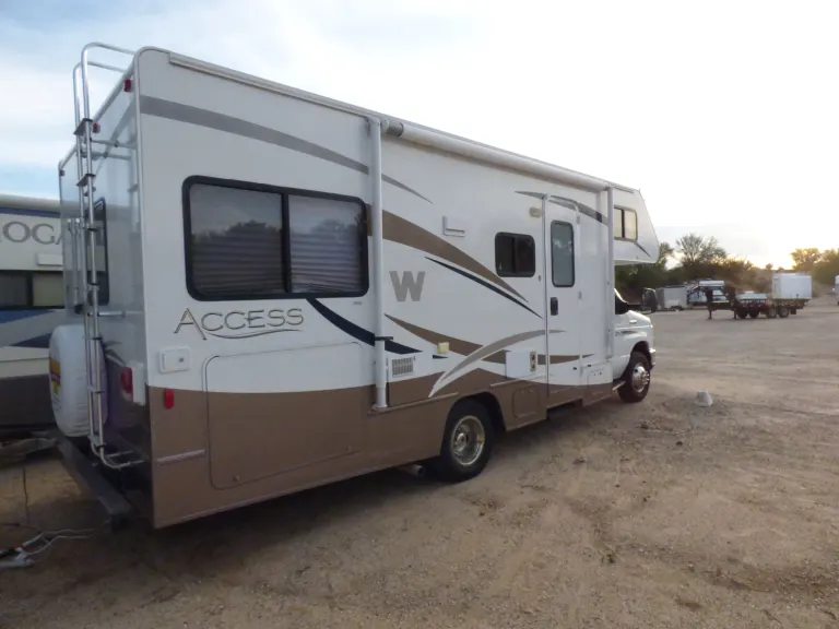 I have a 24 foot 2009 Winnebago Access model. The motor home has seen little use with 38, 000 miles on the chassis, and 180 hours on the generator. All of the appliances are in working order. The motor home ride six passengers comfortable which includes the driver. The chassis has a full size bed in the rear(see photo) and a area to sleep two in the front area(see photo). There is a 24 inch TV mounter up front which enables the riding passengers to watch TV while traveling(see photo). This motor home is great for a family of 4 to 5 traveling across the US. The chassis is manufactured by Ford with a V10 engine.