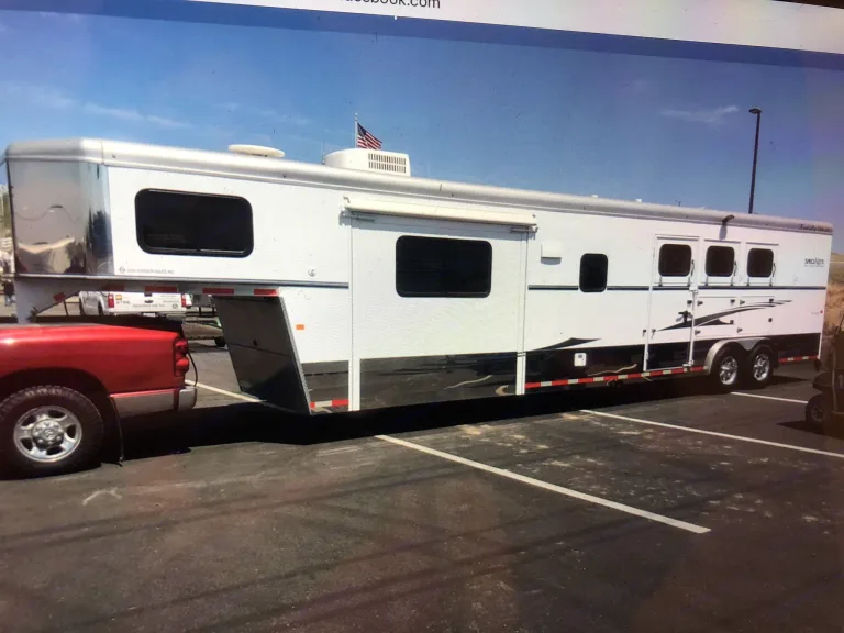 I have a 3 horse slant Trails West with live in quarters. A California King sized bed with reading lights, fold down couch and the dining table (pop out wit awning) can be made into a bed, as well. 2 burner cooktop with range hood, 6 cu ft Double door refrigerator, black dual sink with water filter attached, and microwave. 18,000 BTU Forced Air Furnace, Ducted Air Conditioner (2) 5 gallon LP tanks with auto Changeover, fully insulated floor, ceiling, and walls. I have slept in it it, toasty warm, in freezing weather. 36x40 shower stall within glass door, 12 volt exhaust fan, fresh water flush toilet, wash basin with vanity, large wardrobe closet. The water fill door locks, fire extinguisher and CO/Smoke detector, alternate emergency exit. 60 gal fresh water tank, 28 gal gray and black water tanks with 6 gal DSI water heater. She’s got mangers and barred windows, sure grip padded floor, three saddle racks in the tack room with lots of hooks for halters and bridles. The tack room can fold back to make room for use as a toy hauler. There are also two side storage compartments, assessable from outside, also with additional hooks. Automatic awning on the pull out and large, easy to use manual awning on front. The back opens with two full sized doors, side escape door at the front stall and bathroom door opens up into the horse capartment, which makes it really nice to check on t Hingis with you do a pit stop!