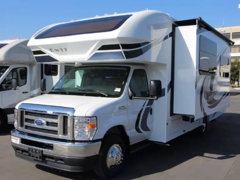 Each Odyssey Class C gas motorhome by Entegra Coach is built upon a Ford E-450 chassis with a 7.3L V-8 305HP engine with 468 lb./ft. torque to power any trip you have planned. Inside, you'll find linoleum flooring, a 32" LED Hdtv, a 55" LED Hdtv, a Furrion all-in-one cooktop and oven, a residential microwave, plus large wardrobes in the bedroom for all your clothes. The models also include aluminum running boards, a 12V LED lit electric awning, high-output marine-grade exterior speakers, plus an outside shower to wash off your hiking gear.