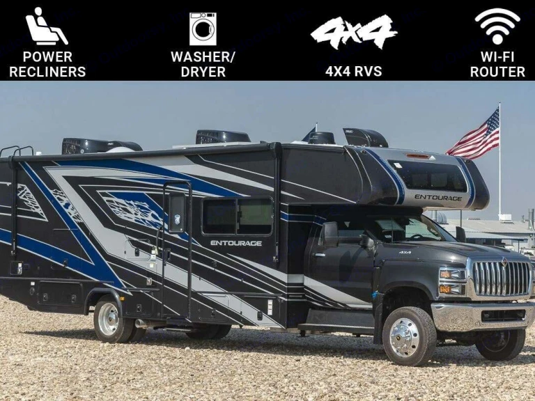 If you're looking for a coach with more sleeping space so your whole crew can join, take a look at this Entourage! You will have your own rear private bedroom with a power inclining king bed slide out, a dresser, plus wardrobe that is washer and dryer ready. Your guests can sleep on the sofa, booth dinette, set of bunk beds, or cab-over bunk, and the full bath is close by for easy use. The kitchen is fully equipped with a three burner LP cooktop with an oven, a residential convection microwave with a charcoal filter, and a 10 cu. ft. 12V double door refrigerator for food storage. You will enjoy your time outdoors as well since there is an outside entertainment center.The Entourage is Coachmen's first super C diesel motorhome and it is packed with upscale appointments and solid construction so you can enjoy the RV lifestyle for years to come. This coach features a 4x4 diesel chassis (either a Chevy Silverado 5500 with a V8 6.6L diesel engine, or International CV chassis, depending on the model you choose), plus 50 amp service and a 2,000 watt invertor for all your power needs. The mandatory Icon Package includes a porcelain macerator toilet, auto generator start with dual batteries, 50 amp service, a tankless water heater, and more!
