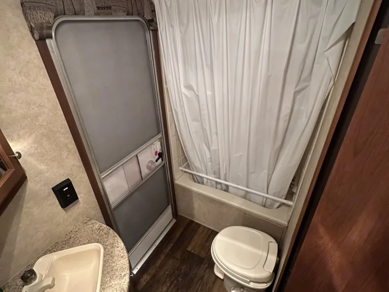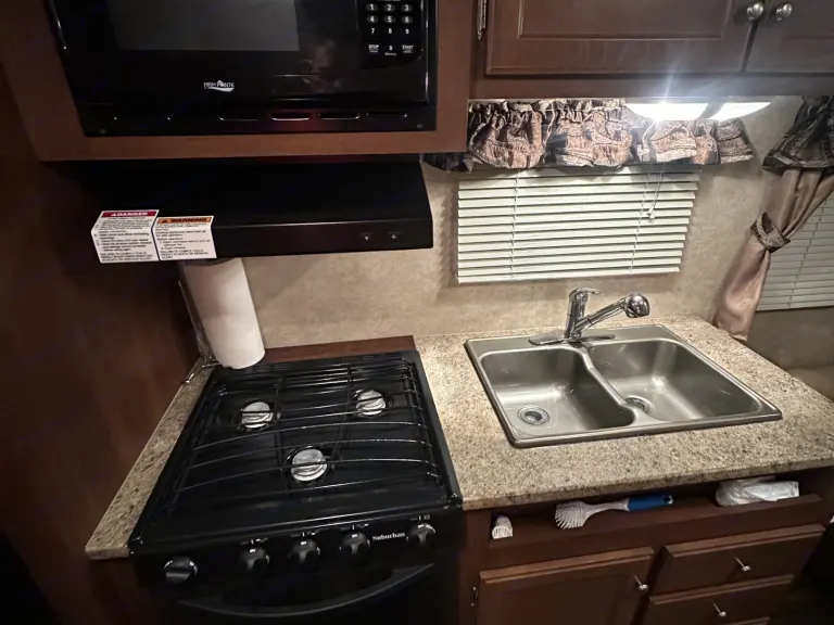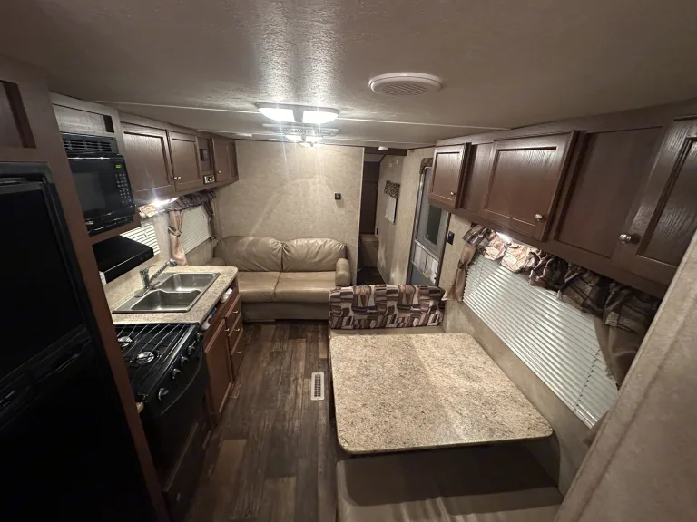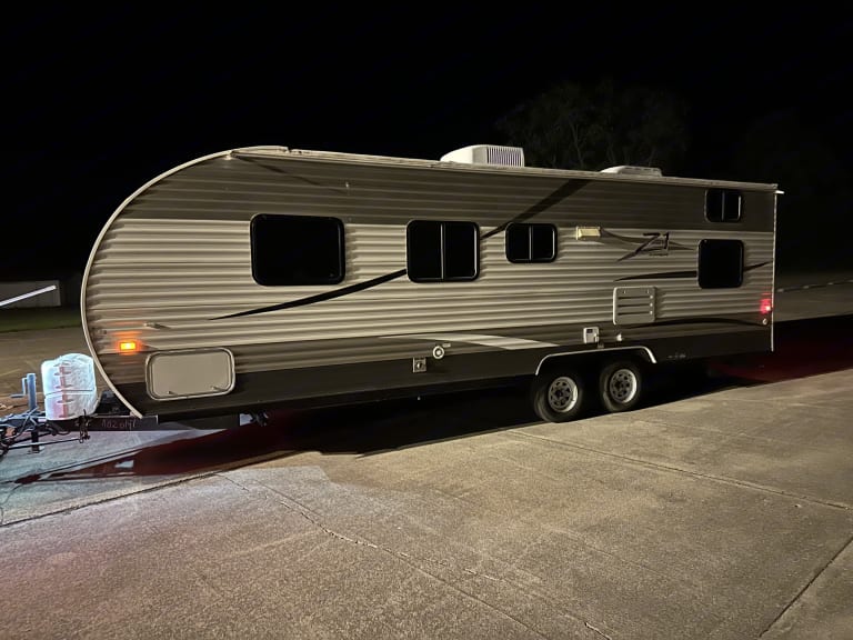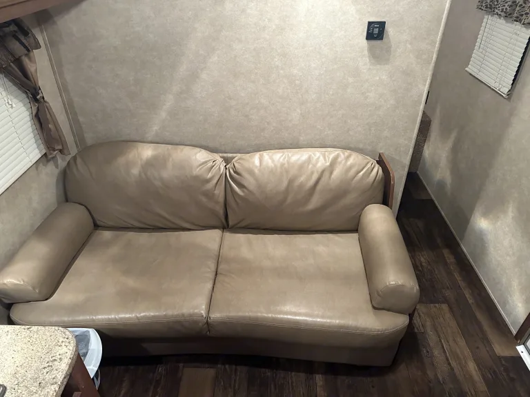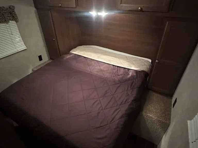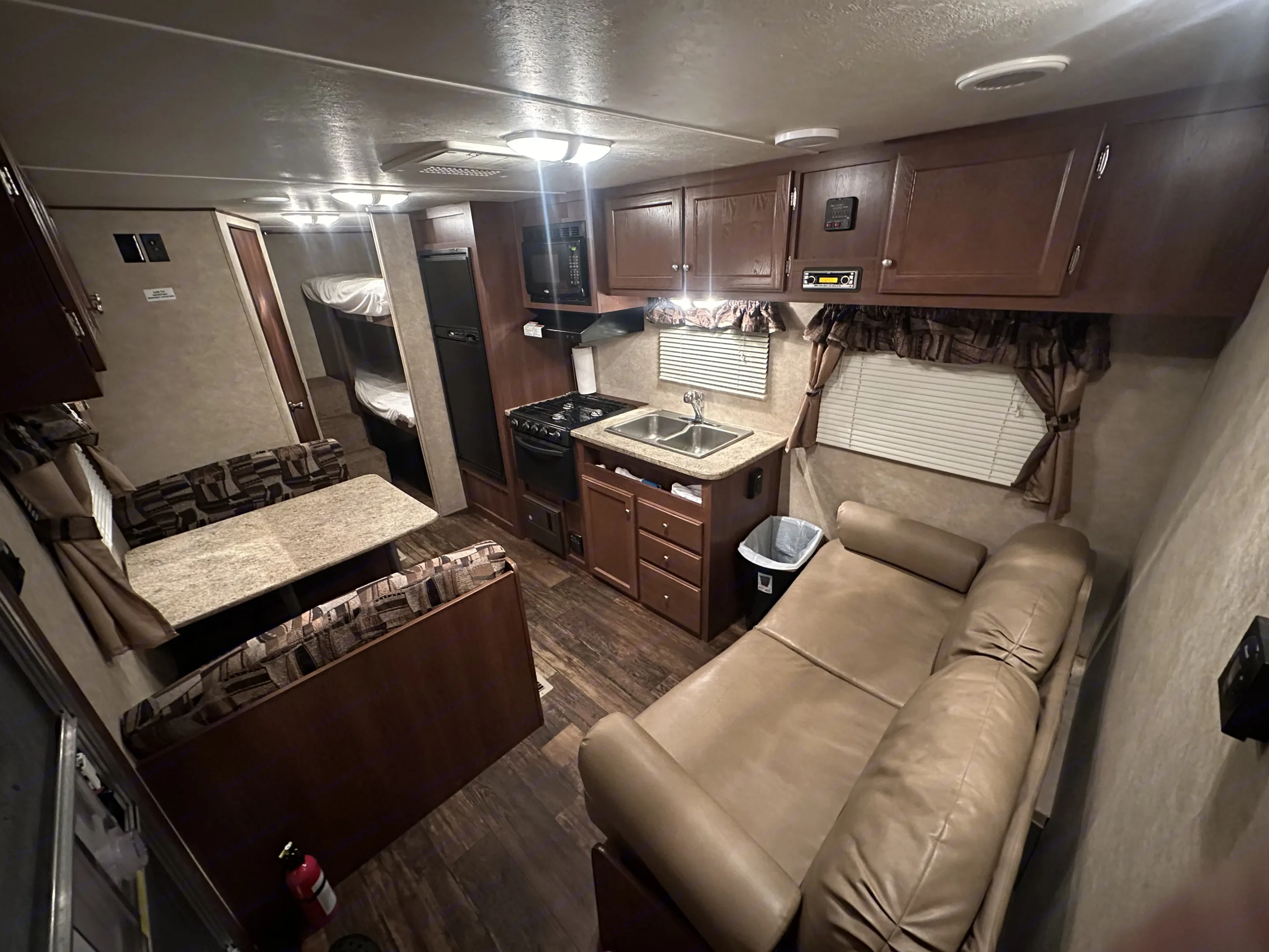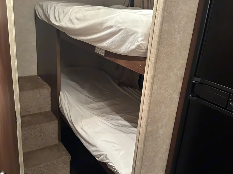 Queen bed on one end with three large bunk beds on the other. I’m 6’2” and fit great! Couch and dinette covert to beds if needed, but not great for adults. Full bathroom and kitchen amenities make for an effortless comfortable camping experience. Easy to pull with most half-ton trucks with our included hitch and anti-sway bar setup (Gvwr 7500 lbs). What's included• Keurug coffee maker