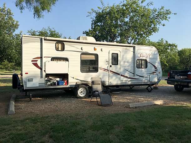 Electric fridge, microwave, and AC. 1 Propane bottle included. Stove/oven works with propane.Great camper for beginners and shorter trips. We set up and pick up. No hauling permitted. Local renters only within a 25 mile radius. You may inquire about a further distance for approval. Unable to book for more than 3 months in advance.We provide basic kitchen items. You are responsible for plates, food, drinks, and paper goods (including toilet paper). We also provide sheets for four beds. You provide additional bedding, kitchen towels, and bathing towels.Camper InventoryShould you find any of these items missing, damaged, or they become damaged during your stay please let us know. Additional charges from your deposit may be incurred if these items are not in the camper upon return.Consumable Items