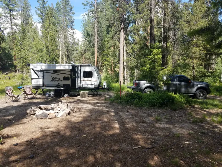 This trailer has a double size bed up front and bunks in the back. Has a 2 burner stove and a refrigerator. 20 Gal. Fresh water tank, and 15 Gal gray and black tanks.