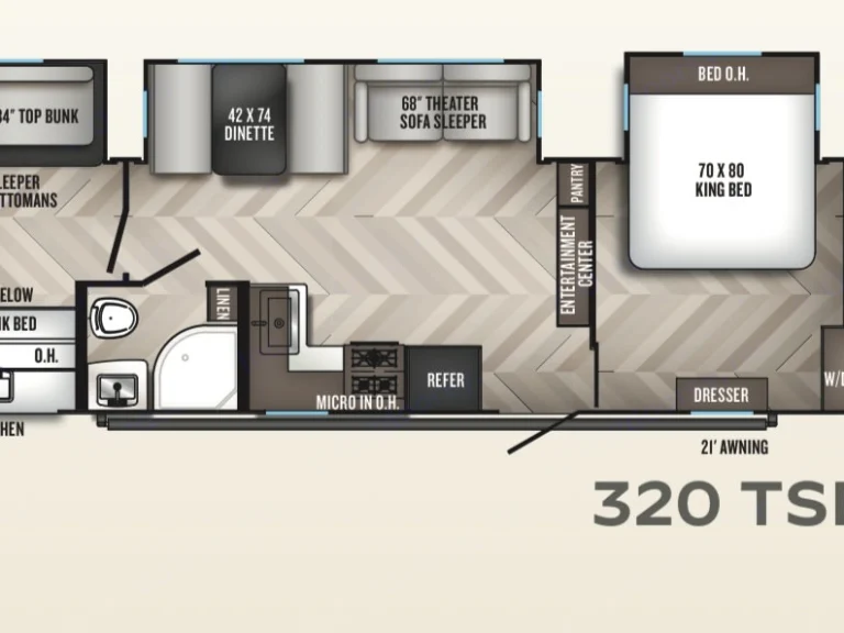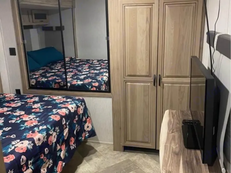 RV rental bedroom interior: floral bed, mirrored bunk reflection, wooden closet, and TV stand. Cozy travel accommodations.. Palomino Solaire 2021