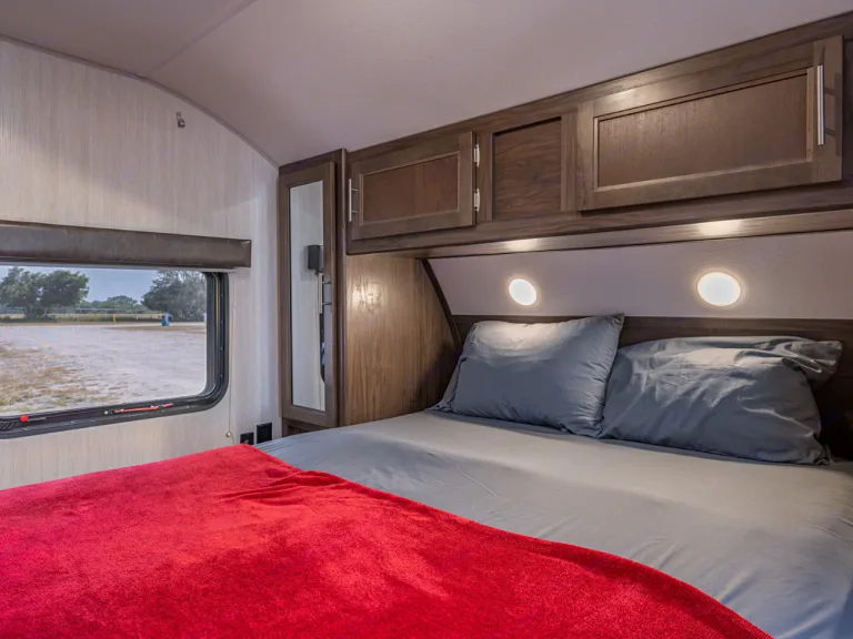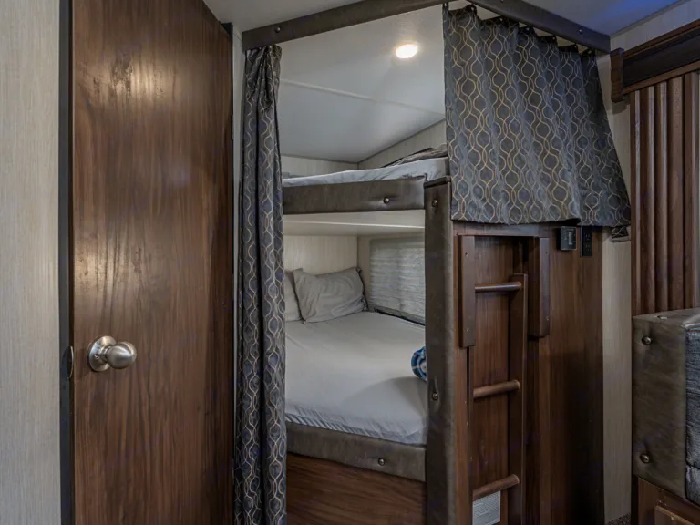 Built for the outdoors, the Grey Wolf is a sturdy bumper pull that comfortably sleeps six to eight people and is perfect for hunting, fishing, hiking, or trekking through muddy outdoor conditions. Inside, however, is a familiar interior with a fold-out couch, a fold-out kitchen table, two bunk beds, a super slide out, two doors, and a Smart TV over a functional fireplace. Also included is a touch of luxury in the Queen bed master bedroom, a perfect place to spend the night after a long day on the trail.