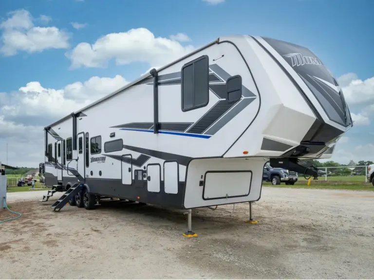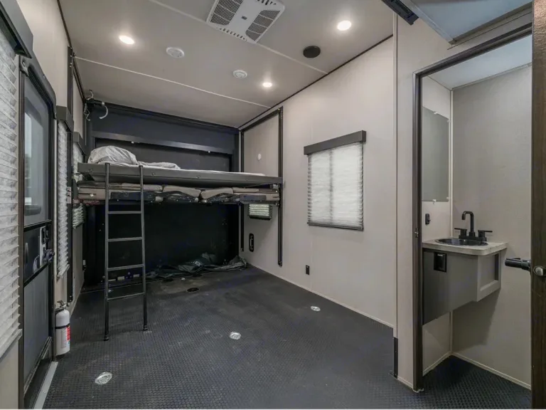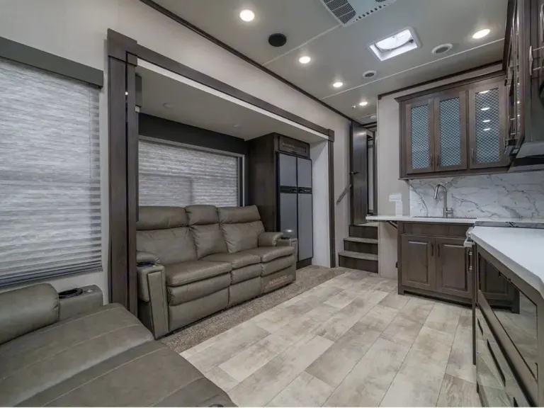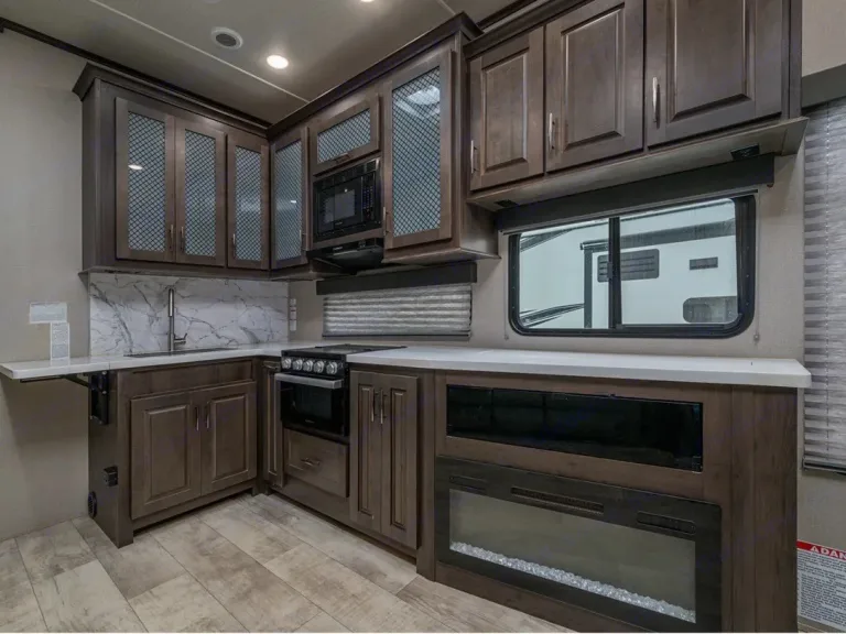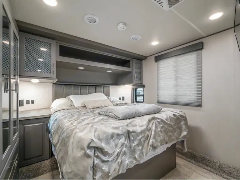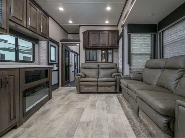A supremely luxurious ToyHauler with a fire place, residential-size refrigerator, white marble countertops, smart TVs, and two walk-in bathrooms. Its three queen-sized beds in the second bedroom and single king-size bed in the master bedroom make it a good option for accommodating large parties.