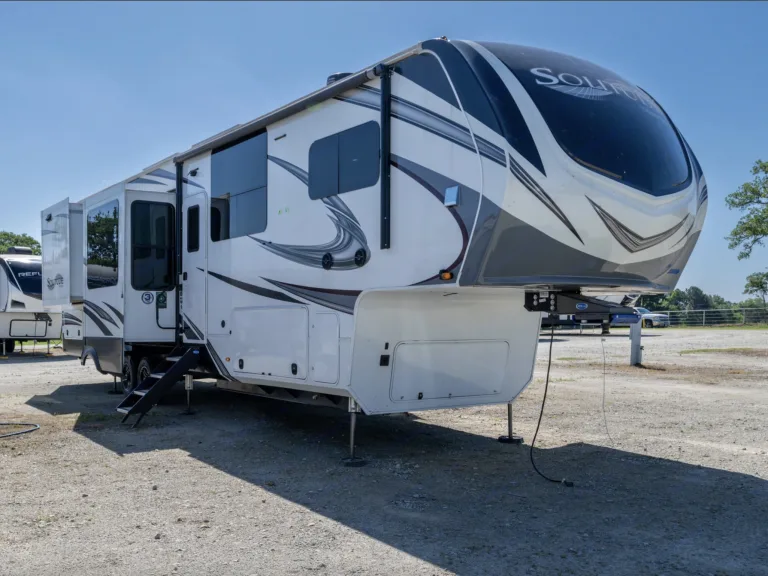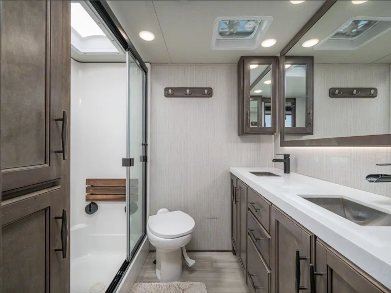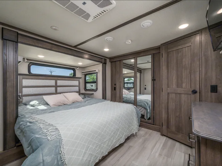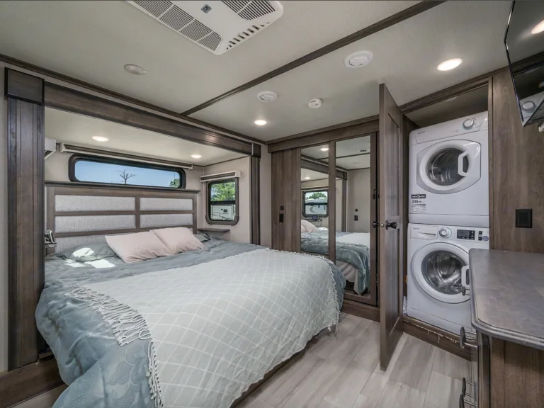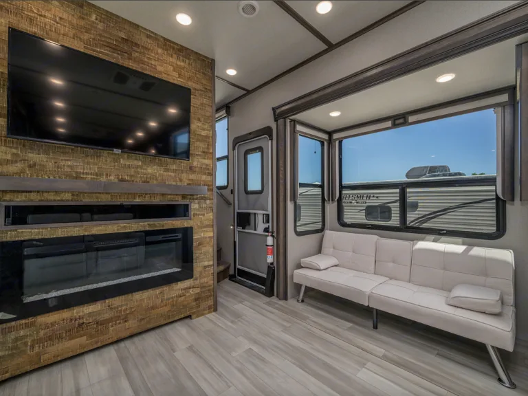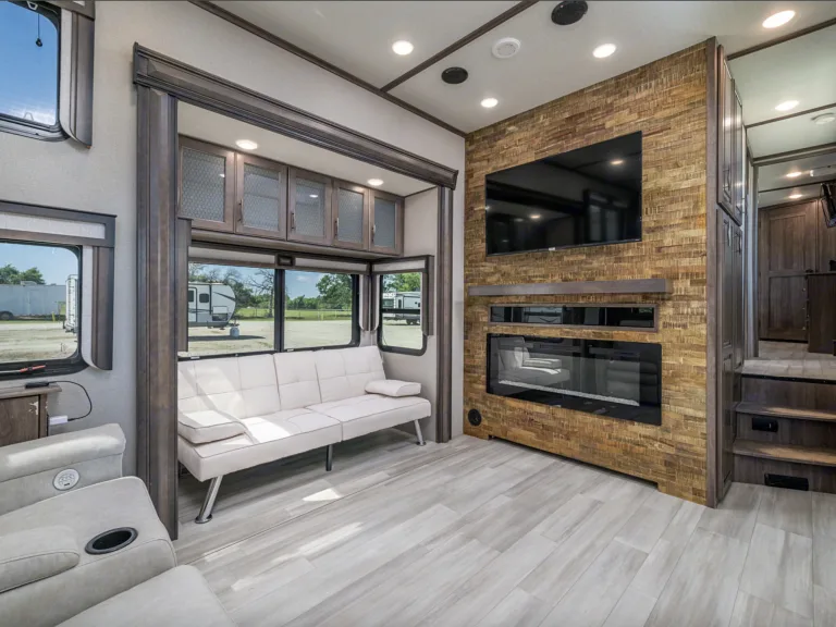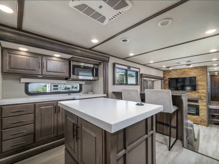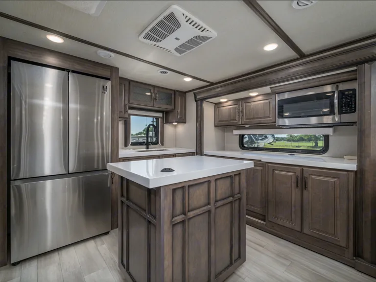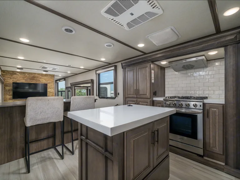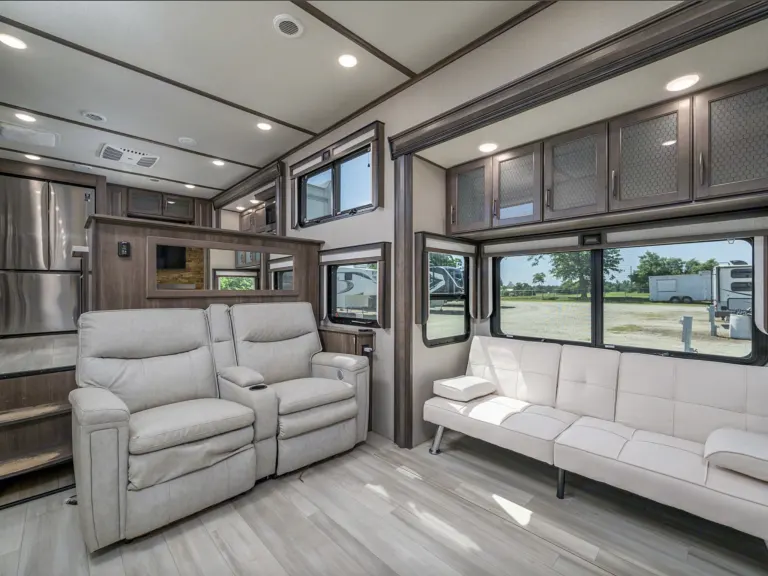 A beautiful 5th wheel with a residential double-door refrigerator, residential-size stove and oven, and a roomy bar area with white marble countertops overlooking the living room, itself complete with a sports heated massage chairs and two pull-out couches. A full bathroom, walk-in closet, and king-size bed make for a spacious and luxurious master bedroom, and a built-in security to round out the full at-home experience.
