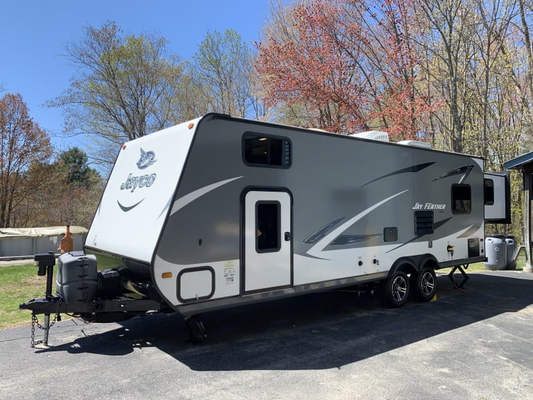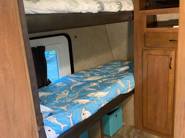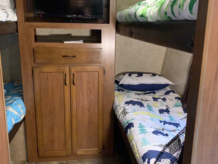 *3 night minimum()**7 AM drop off for deliveries and pick up on bookings between Tuesday-Saturday. Deliveries over 65 miles away from Tyngsborough,MA need to be done on Sundays or Mondays*Delivery charges have gone up due to gas prices.30$ Per tank to refill propane tanks if not refilled upon return of RV.Welcome, we have a very nice camper, if I do say so myself.;) We love the 4 bunk beds. Each bunk has its own plug, which allows any type of electronic to be charged. There is also a 32 inch TV In the bunk room, which is nice on a rainy day. The kitchen comes equipped with pots and pans, cups, mugs, plates, bowls, cooking and eating utensils, steak knives, tea kettle and mixing bowls.The bathroom has a tub and a shower. The tub will fit the little ones who still take baths. You’ll also find bath towels, face cloths and hand towels. Also we have cleaning supplies under the bathroom sink. There is also extra space for your essentials. The dinette fits everyone around it to eat. Which we really loved about this RV. So, if it is cold or rainy everyone can fit eating inside!! The dinette also turns into a full size bed! What is best of all is the king sized bed that has a mattress foam top on it!! So comfy!! The camper also has an outdoor shower, for sandy feet or anything that may need a rinse.