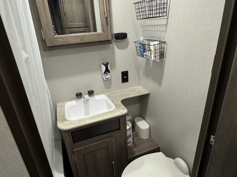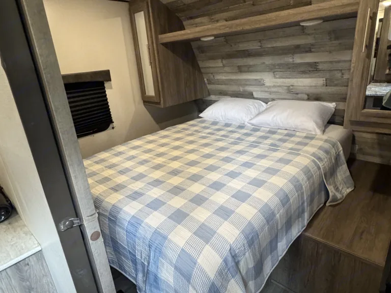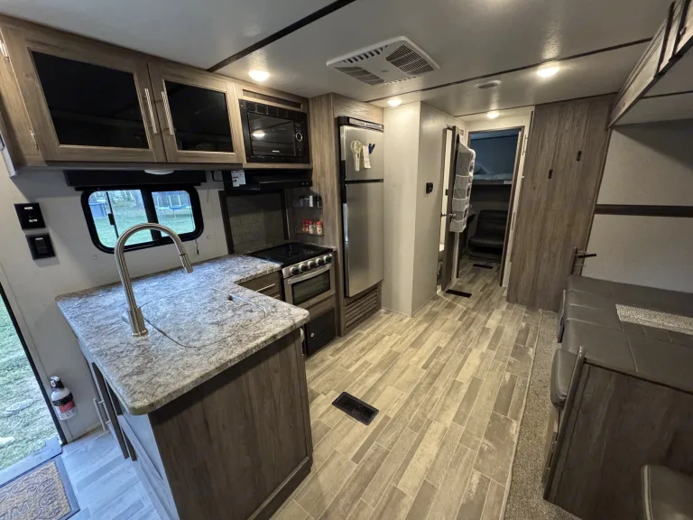 Sleeps up to 9- Offers a master bedroom with a queen bed and a private bunkhouse making it ideal for large families or groups.Outdoor Kitchen: Equipped with a sink, stovetop, mini-fridge, and storage space, perfect for cooking and entertaining outdoors.Spacious Interior: Features an 81" interior ceiling height and flush floor slide-outs, creating an open and inviting living space.Modern Kitchen: Includes a 10 cubic foot 12-volt refrigerator, a 3-burner stovetop with glass cover and oven, a microwave, a stainless steel sink with a high-rise faucet, and LED accent lighting.Comfortable Living Area: Boasts a U-shaped dinette that converts into a sleeper, a sleeper sofa, an entertainment center with a soundbar and 30-inch fireplace, and ample storage throughout.Convenient Bathroom: A fully equipped bathroom with a spacious shower/tub.Exterior Enhancements: Equipped with radial tires, Keyed-A-Like door locks, a power awning with LED lighting, power tongue and stabilizer jacks, and an outside shower.What's included• kitchen utensils, coffee pot, pots/pans, children’s plates and bowls, coffee cups, silverware.
