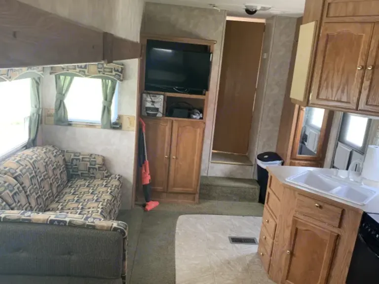 Great 5th wheel camper to make memories with the family in. The master bedroom has a queen size mattress. Has a rear bunk room, pull out sofa bed, and dining area converts into a bed.What's includedFresh linens, camping chairs, folding table, cookware, and dishware are all included in the camper.Other things to noteWhile are dog owners ourselves and welcome pets with open arms, we ask that you ensure you clean up after your pet or an additional cleaning fee will be charged.