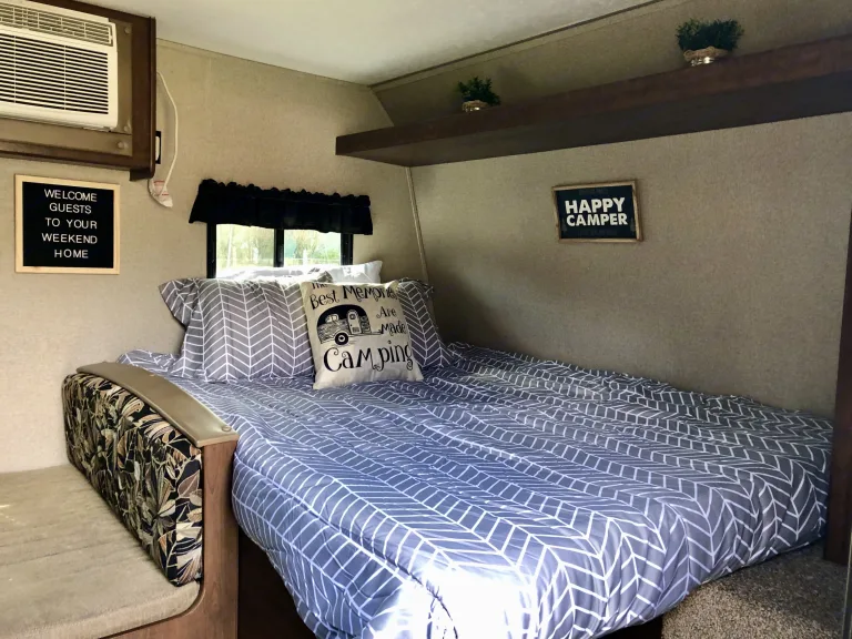 Looking for a weekend getaway? Our trailer is here to make those vacation trips happen! Our trailer can hold up to five people and comes ready for camp. Enjoy bedding for the queen bed along with options for the bunk beds, dishes are provided along with pots and pans. We know kids may love some Mac n’ cheese while camping! Need a coffee in the morning? We got it, enjoy our Keurig with any flavor of coffee you desire to bring. Full bath is available , 2 burner stove to cook, and a fridge to store some food. Last but not least, we have heat and AC for comfortable nights. This trailer is the perfect vacation home for a SUV or truck to pull with a max weight of 4,000 pounds.