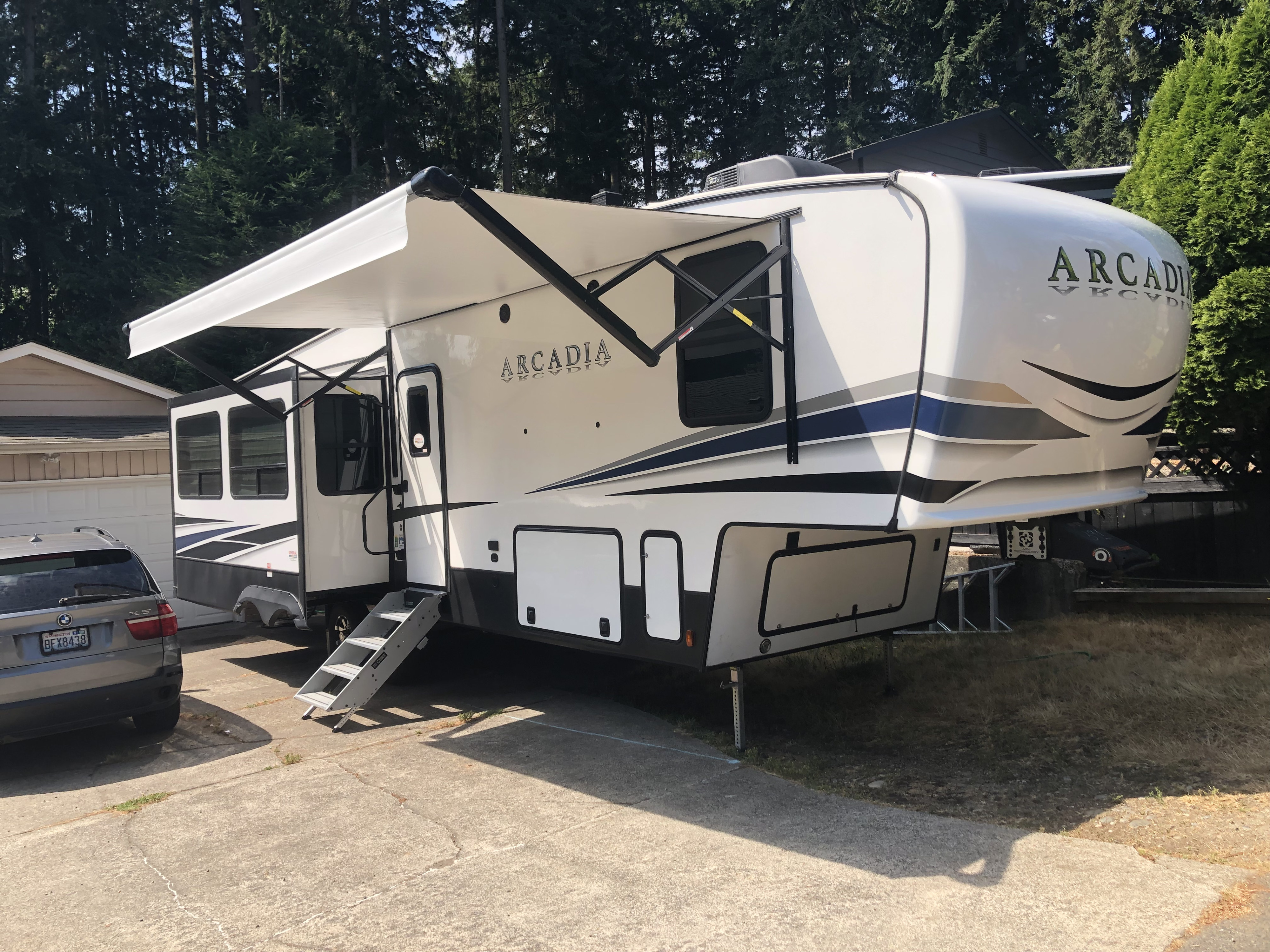 Modern 5th wheel with Cali king bed and Queen pull-out bed. High ceilings, spacious kitchen and pantry!! Gas cooktop, Two A/C units. Electric fireplace. Fridge has backup propane power. Great choice for glamping in the PNW.