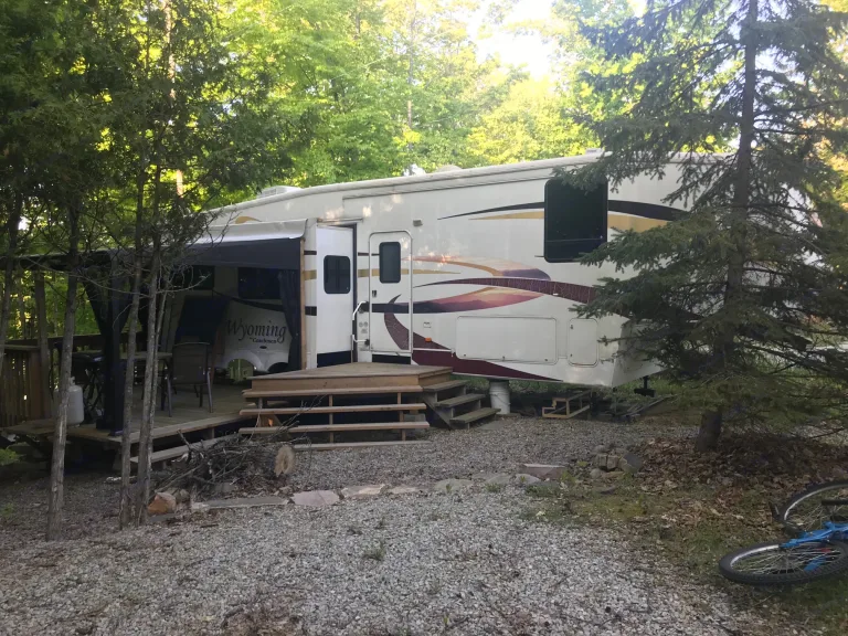 This trailer is parked in a Christian camp ground in the Muskokas, the campground offers swimming,boating, programs for kids and seminars for adults.
