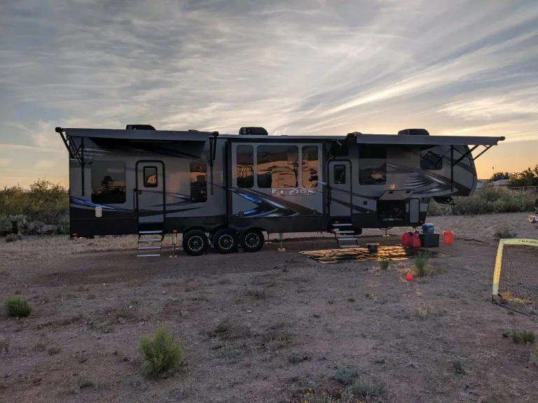 This 43 ft 5th wheel toy hauler is camping luxury at its finest. Beautiful trailer that will give you all of the luxuries of your home, on any adventure or trip you desire. Trailer sleeps 7 adults comfortably but kids could fit around ten. Trailer has a birds-nest bed as well that a child can sleep in. Three air-conditioners power perfect living conditions in any weather and is also equipped with a gas fireplace and heater for those chilly nights. LED lighting inside and out will keep it bright for entertaining. Heated and reclining residential couch, 50 inch LED TV and residential sized refrigerator will keep the kids entertained and allow for long trips without needing to go to the store for anything. This will also be provide pots & pans, bedding, utensils and camping chairs. This trailer will only be delivered to your camping spot of choice, it cannot be pulled on your own. Delivery fee is a standard $300 fee that includes set-up of the trailer. All renters must ensure camping spot can fit 43 ft. trailer before delivery.
