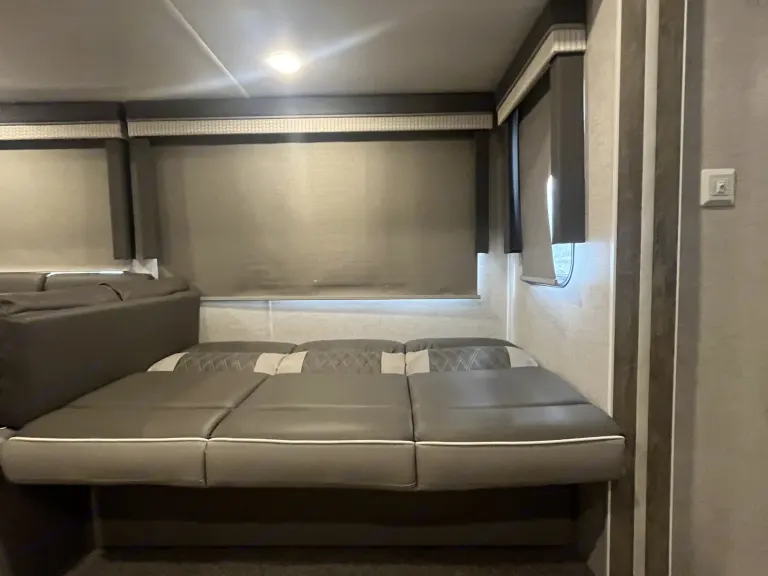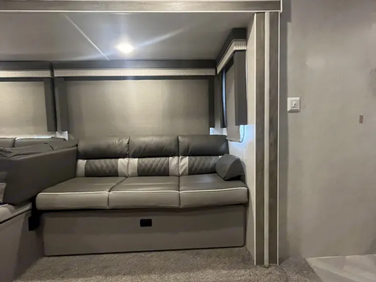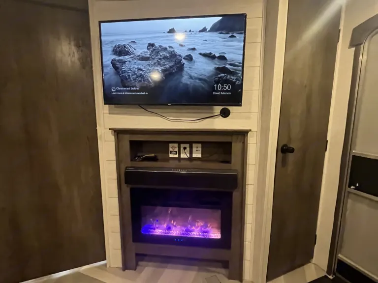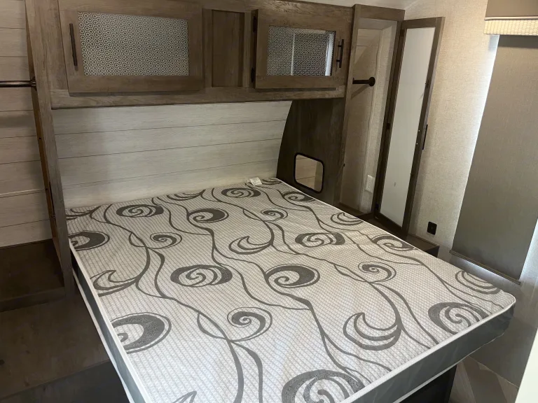 Our Trailer sleeps 8-10 depending on the size of your people. There is a camping queen in the main bedroom, the bunks are double bunks so they could sleep one adult/larger child or two smaller children on each bunk, and then one of the nicer features is that the sofa and dinette layout into one continuous large flat sleeping area that is like have two full size beds pushed together that could sleep 4 adults Salem calls it their "versa lounge" (This is one of the main features that sold us on buying this trailer). We have a 43" flat screen TV in the living area right above the electric fire place/heater. It has plenty of under belly storage for all you camping gear. Also on the outside is a mini kitchen with a small drink fridge and small gas griddle. Where ever you go to enjoy you outdoor adventure our Salem will give you a great "glamping" experience enjoying your adventure without sacrificing all your normal amenities. What's includedAll the hook ups for the rig, utensils in the kitchen, and toilet paper for your trip.