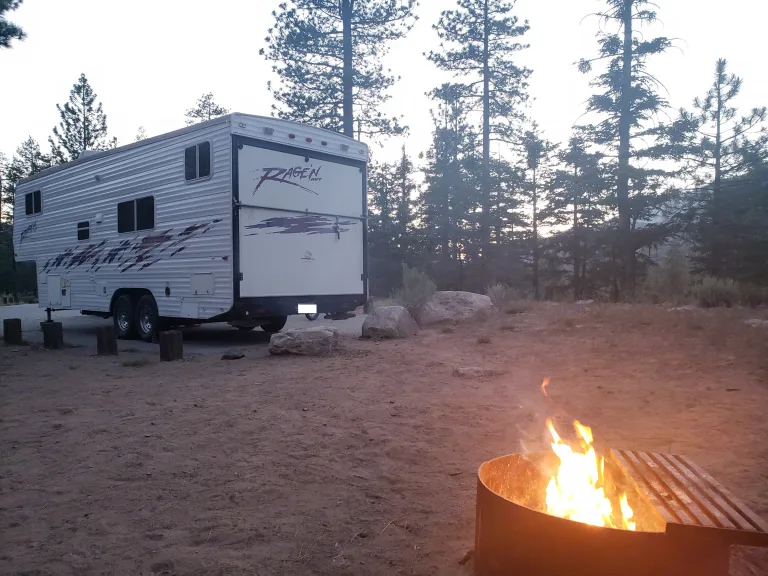 Full Linoleum flooring means easy cleaning and protection from whatever comes in with your toys. A private master bedroom with walk around queen bed and spacious bathroom with shower and tub.You have a full kitchen with stove, oven and microwave, air conditioner, heater, TV, Stereo with indoor and outdoor speakers round out the living arrangements. Dishes, Cookware and utensils are included. There is an outside awning to keep you cool during those warm days. This easy to tow trailer is fully self-contained with a generator keep the dual-batteries charged!The 25 gallon fuel tank and the two large propane tanks will be full on pickup, and this trailer has plenty of water with a 106 gallon fresh water tank.30 Foot 5th wheel model is easy to navigate in n out of the campgrounds