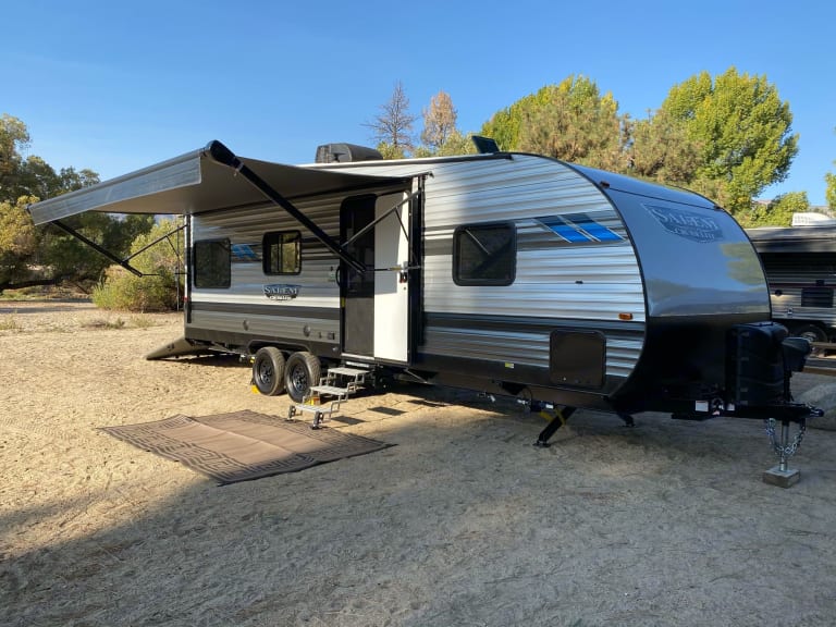 Some of the other offerings include: Private Queen Bedroom w/mirrored hanging wardrobes on both sides, Outdoor Shower, Power stabilizers and tongue jack, Full underside pass-thru storage, Teddy Bear mattress, Bluetooth stereo, Outdoor speakers, (2) 7 gal LP tanks and more! (Please Note): You must have a 30/50amp power connection at your campsite destination or at least 3000 running watt generator if dry camping. (We can provide you with a generator for a small fee if needed.) Also, smaller pets are allowed for a small fee however, Must be kept in a kennel if left alone, unattended inside our trailer for ANY period of time. This will avoid any accidents or damages that could occur while pet parents are absent. Please ask about our delivery/setup service to any location within 100 miles in SoCal. The fee associated includes delivery, setup and detailed orientation. After rental has concluded; breakdown and pickup.