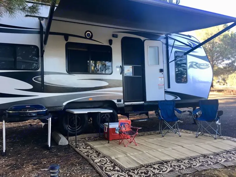 Our 2019 Rage'n 22 EX Travel Trailer will accommodate up to six. The kitchen includes a three range stove top, oven, refrigerator and freezer for all of your goodies, and plenty of space for food and snack prep. For your personal needs, there is a spacious bathroom that includes a shower, vanity, and a real porcelain throne!Our price includes standard kitchen items, plates, cups, utensils, coffee maker, coffee supplies, linens, towels, shower toiletries, camping chairs, outdoor table, out door stove/grill, large outdoor mat, and a welcome gift.All you'll need to bring along is yourself, your food, and your personal belongings!!Check out our Girls Weekend add-on packageSee add-on for delivery fees (schedule permitting).Delivery fee includes black water tank dump and propane tank.A cleaning fee of $75 will be added if the trailer is not returned in the same clean condition it went out. Cleaning products and trash bags are included to help keep the trailer nice and tidy. This helps keep our price low.If the trailer is picked up and returned by customer, it must be returned with the black water tank emptied or there will be an added fee of $80.Trailer weight: 5700 lbs emptyMaximum delivery radius: 75 milesRules: