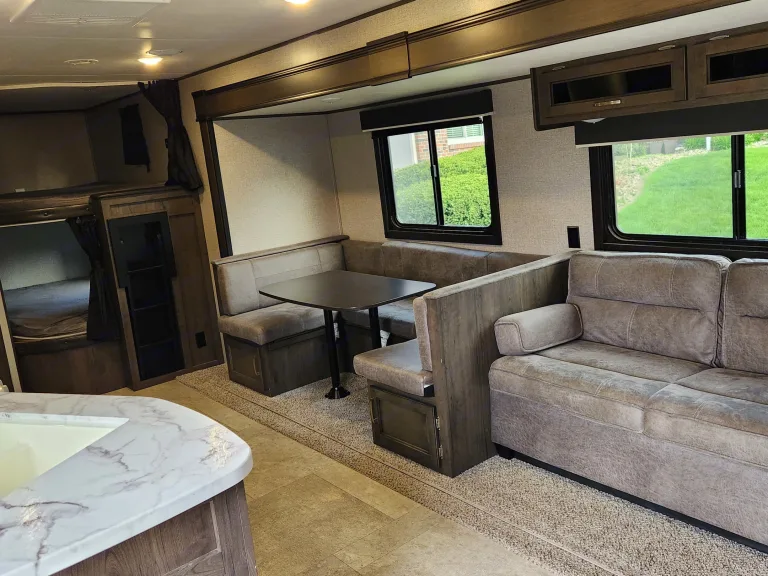 If you’re looking for a family RV, you’ve found it! This camper sleeps up to 10! A Queen Size Bed in a private master bedroom, 2 Double beds in the rear for the young ones, and 2 Convertible Sofa Beds providing extra sleeping space for your children to bring a friend or two! Adults will love the full size shower! The U-shaped dinette slide is great for eating your meals or playing board or card games! Cook up delicious meals for the whole family in the fully-equipped kitchen, complete with a stove, oven, roomy fridge and freezer, and plenty of counter space for meal prep. Keep a comfortable temperature inside your rig with the A/C and heating options. Set up is a breeze with only one slideout to operate, and the pass-through storage area is big enough to hold all of your camping gear too! The camper also comes equipped with electric awning, exterior speakers, and hook ups for outside television to watch sports or a late night movie!