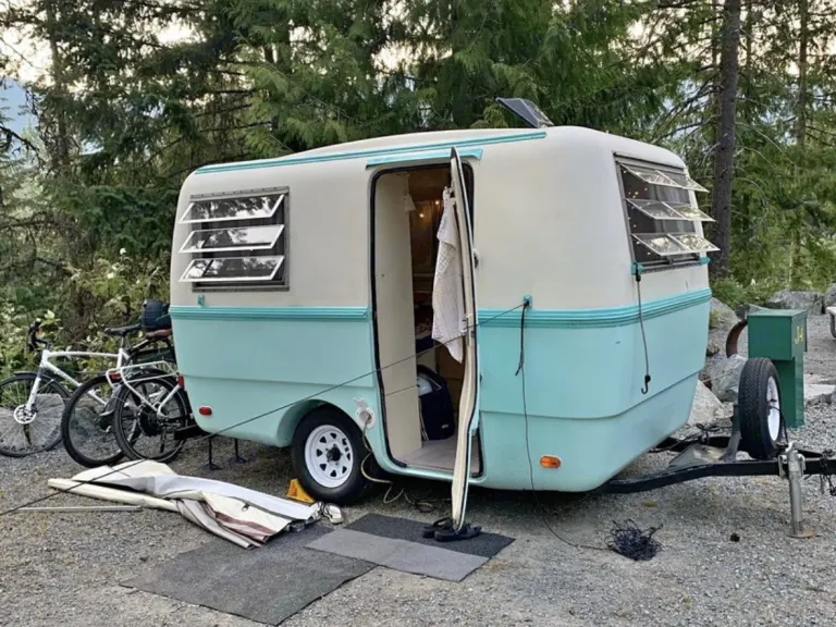 This classic light weight still gets lots of looks. New tires installed 2023. It’s in great condition and mostly original. New upholstery throughout. Electric outlets, fridge and heater make it effortless to operate when power is available. On board water for washing hands and dishes. What's includedFitted sheets, portable propane stove, 2 adult camping chairs, 2 small kids folding chairs, propane bbq, bbq table, camping shelter 10x10, French press, magic bullet, pots, cutlery, coffee, salt pepper, condimentsRecommendationsHot springs around BCOther things to noteYou’ll need to provide your own 1 lb propane cylinders for stove and bbq, trailer has a 1 7/8 hitch.