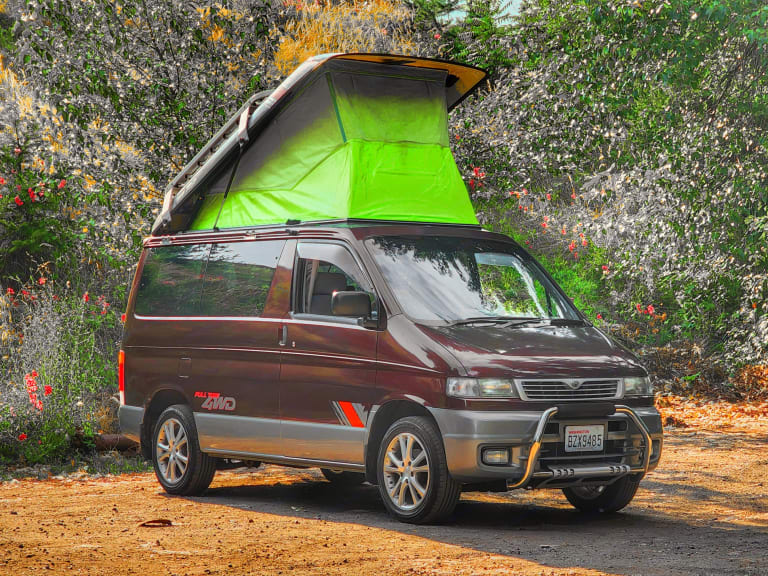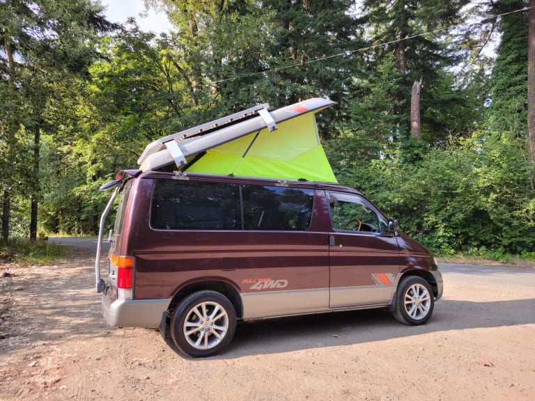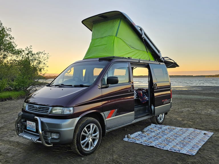 Meet our Mazda Bongo Friendee, Origami named for her folding tent versatility. Does a great job sipping fuel at 28 MPG. This van is a AWD RHD (right hand drive) diesel turbo camper van. Don't let the right hand drive scare you, its quick to get the hang of and an absolute blast that will keep you smiling for your whole trip. The pop up tent is perfect for two people and the rear seats fold down to make a bed as well for any additional people you plan to bring along . Setting up the tent is quick and easy with just a push of a button! Origami also has a roof rack for you to store your extra items. There are power privacy curtains for the side windows and pull shut curtains for the front and rear of Origami.If there is anything else you might need for your adventure let us know and we might be able to get it for you.What's includedDiscovery PassUpon request if needed: