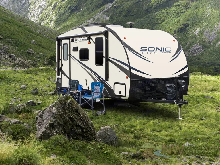 Despite being ultra compact and one of the smaller trailers in our fleet, this 16' tow-behind isn't missing any of the classy fit+finish or lush comfort that NW Adventure Rentals prides itself on. Outfitted with a full kitchen, bathroom, and queen sized Murphy bed for space efficiency, as well as plenty of storage to house everything you need for your getaway, this little rig is sure to please our adventure seekers with smaller parties.This unit has: