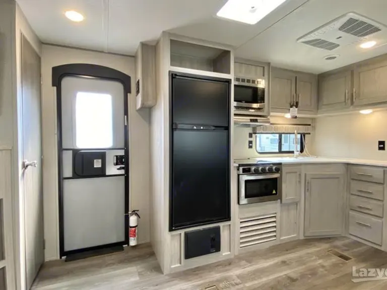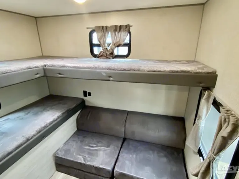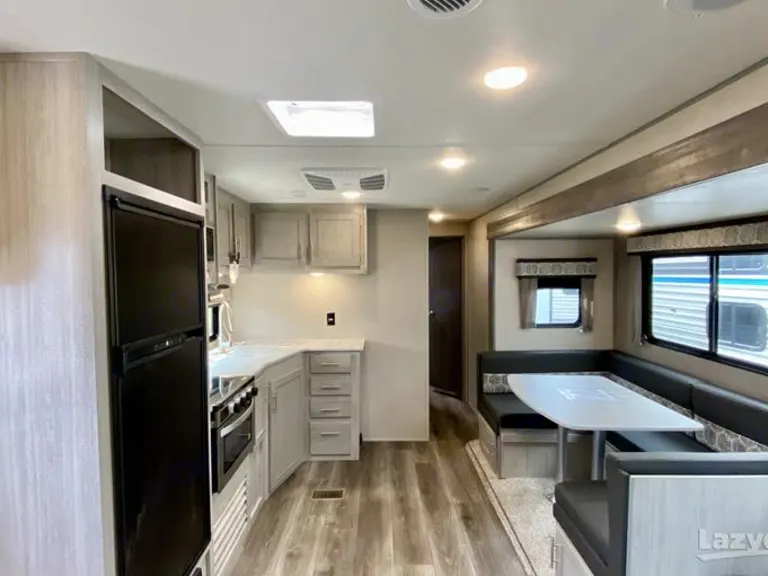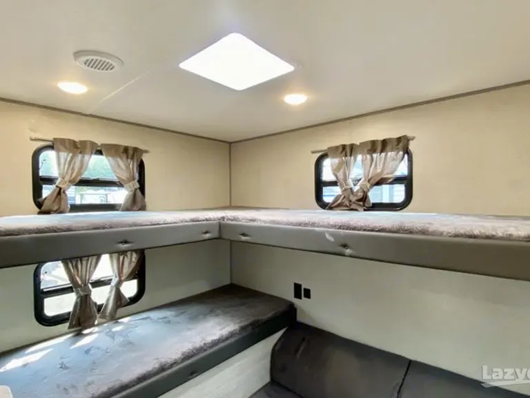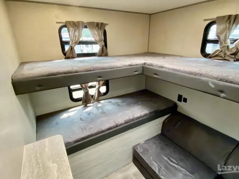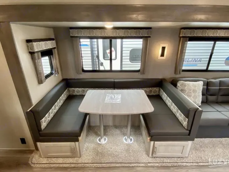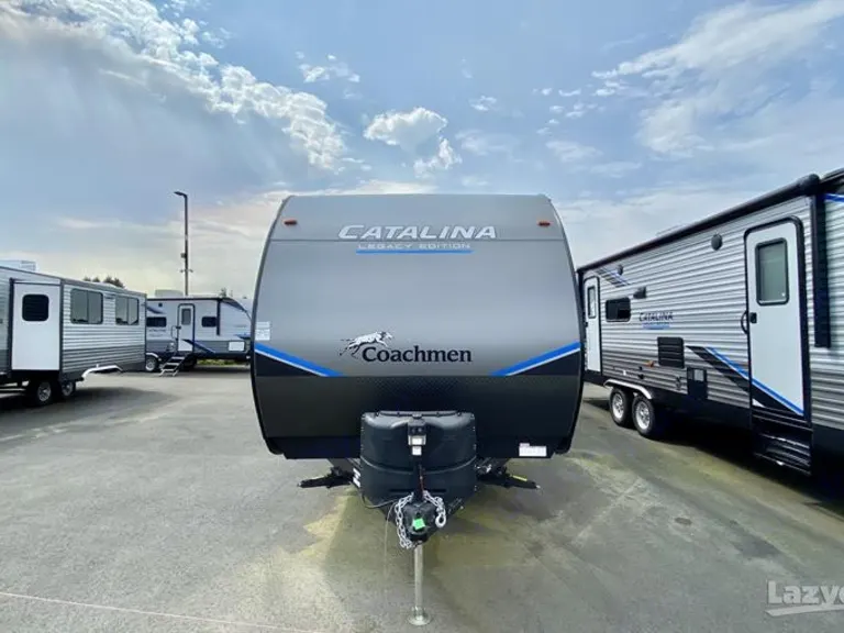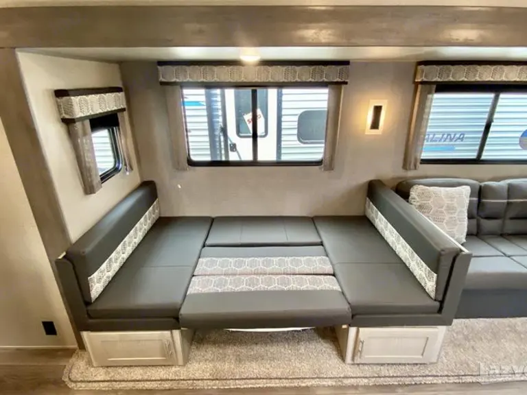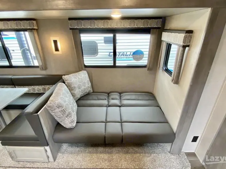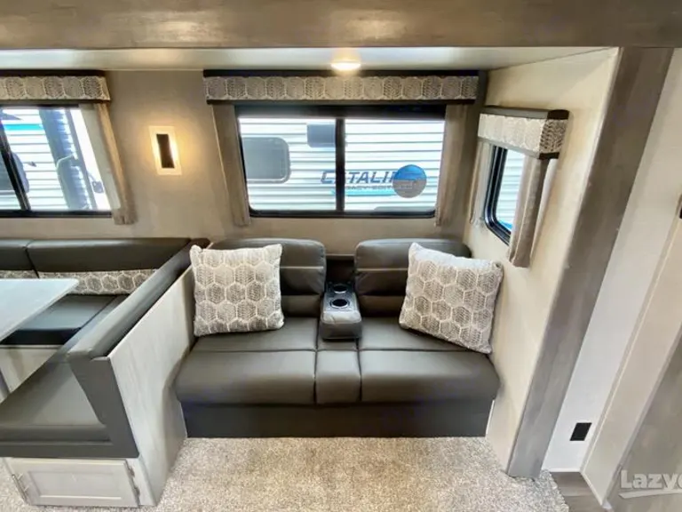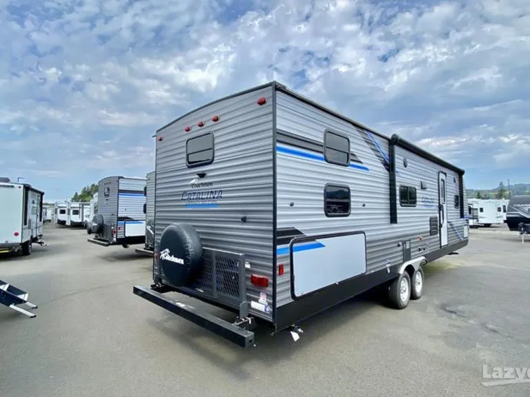 2022 Coachmen Catalina Legacy Edition 303Qbck Offering 2 bedrooms including a rear bunkroom with sleeping for 4-5 and a front queen room. Additional sleeping in the living area with a dinette booth and jiffy sofa. The corner kitchen will give more counter space than normal and with a corner entertainment you can comfortably watch from anywhere! The large pantry with shelves will allow you to stock up on everything so whether your seasonal or traveling. This is a great layout. What's includedCookware, utensils, broom, mop.