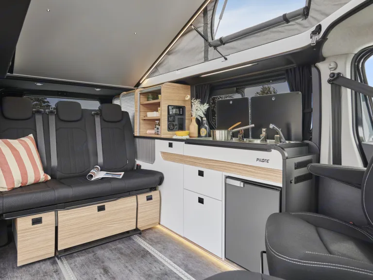 La partie cellule du van aménagé Pilote CV545BC offre un très grand espace salon dans lequel on peut facilement positionner la table. Sa banquette sur coulisses permet de moduler l’espace en fonction de vos besoins. Cette fonctionnalité est très appréciée sur route pour rapprocher les passagers à l'arrière de ceux en cabine et ainsi, papoter ensemble. De nombreux rangements sont disponibles, notamment 2 tiroirs à ouverture à 100% sous la banquette. Plusieurs points d’éclairage offrent une grande possibilité d’ambiance une fois la nuit tombée. De nombreuses prises USB sont très facilement accessibles.