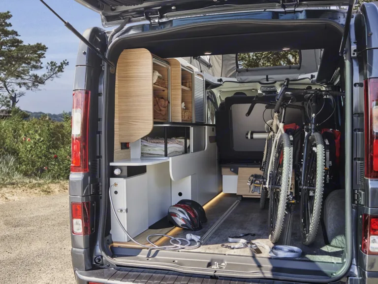 La banquette arrière du van aménagé Pilote CV545BC se transforme très facilement en un lit 2 places parfaitement droit d’une largeur de 124 cm. 4 prises USB sont très facilement accessibles et vous permettront de recharger tous vos appareils électroniques. Pour une parfaite intimité, chaque fenêtre du van aménagé Renault Trafic CV540BC a des rideaux occultant et un système a également été développé pour le parebrise et les fenêtres de la partie cabine. Le toit relevable dissimule un grand lit 2 places pour devenir une chambre avec vue grâce à ses 3 ouvertures. Tous les rangements restent accessibles lorsque le lit est déplié.