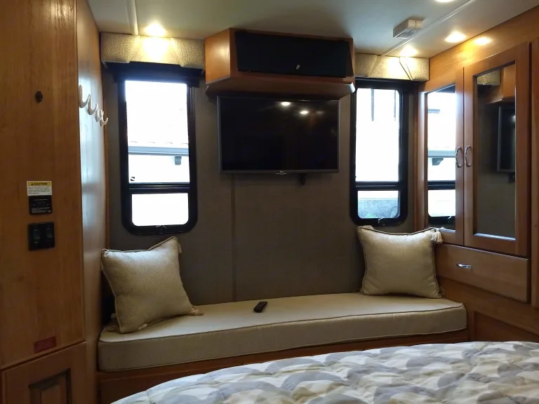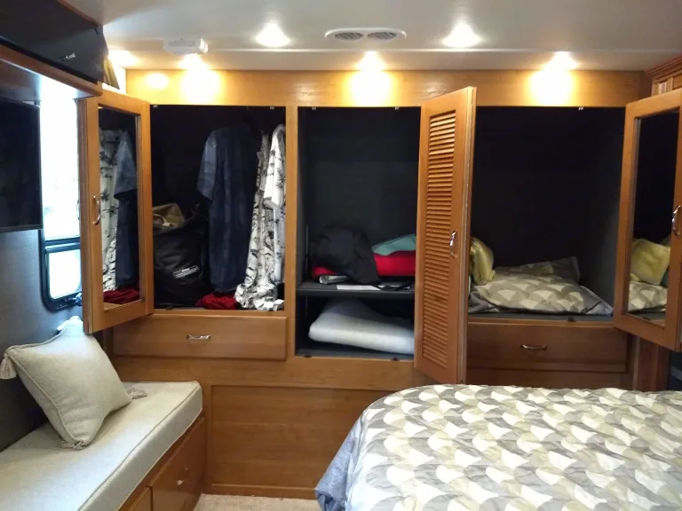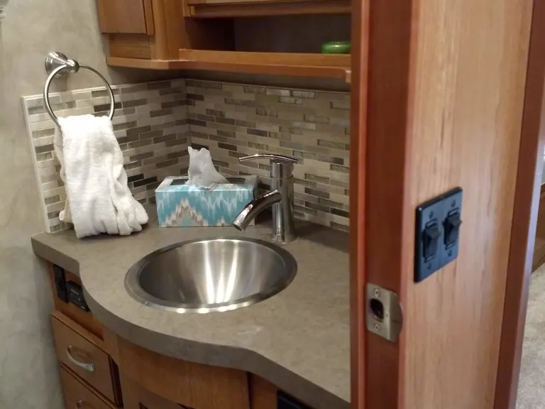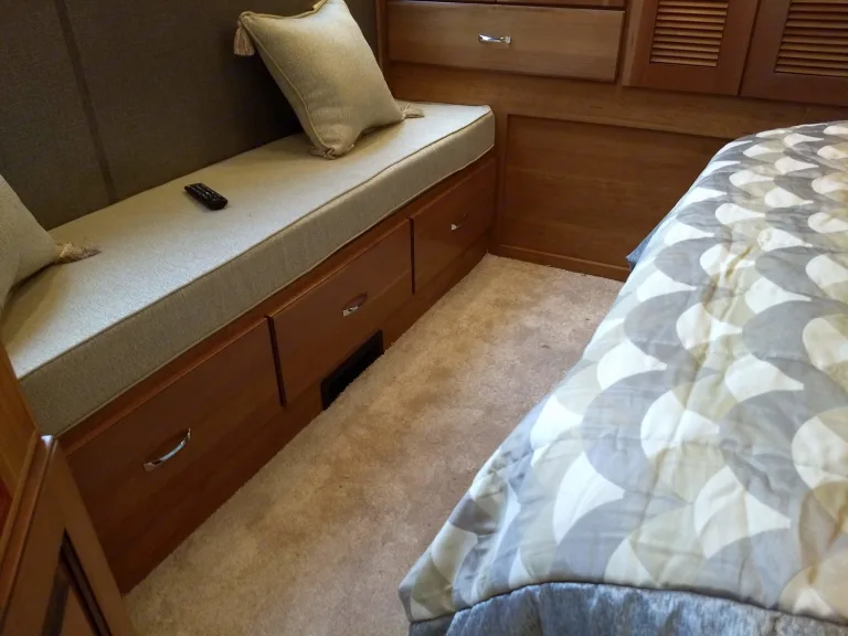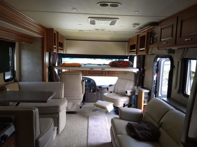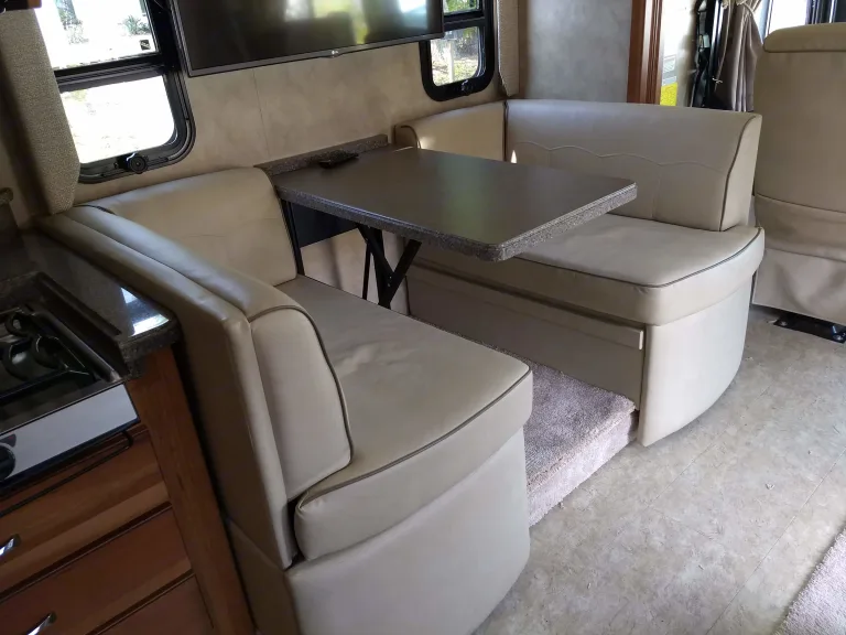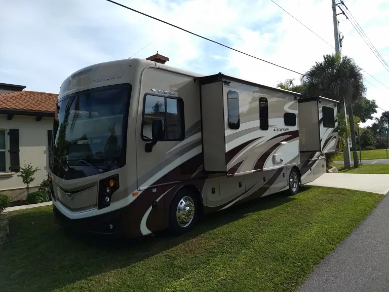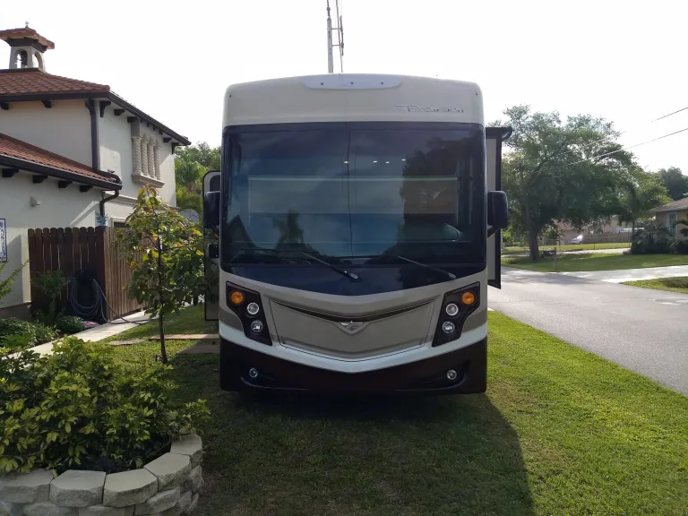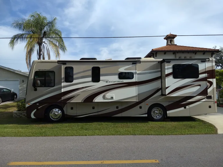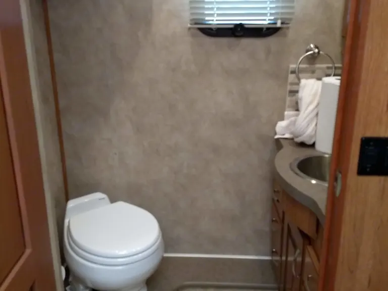 Sink and toilet separate. Roomy shower with glass slider and skylight. Master BR has queen size bed with built in nightstands and sitting area. Lots of storage. TVs in living, master BR, and exterior. Sound system. 2 AC systems, automatic leveling jacks. Large retractable awning (automatic) This RV comes fully equipped: Dishes, pots and pan, towels, soaps, bed linens and bedding. Beach chairs and tables. 2 Bikes available upon request. Airport pick up from Tampa, Sarasota, Punta Gorda or Ft. Myers available. We'll pick you up and drive you directly to your RV for orientation. This unit can also be rented during the winter season if you'd like to be stationary in an RV park. Will deliver and set up. Please contact owner.