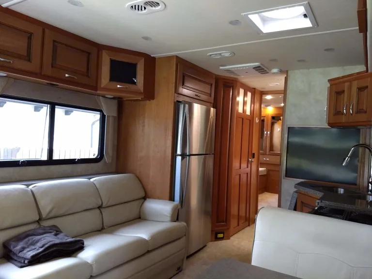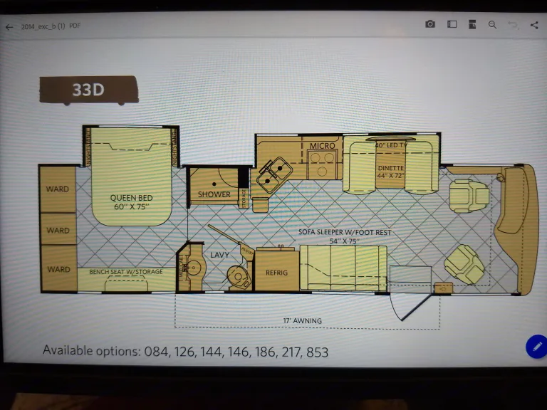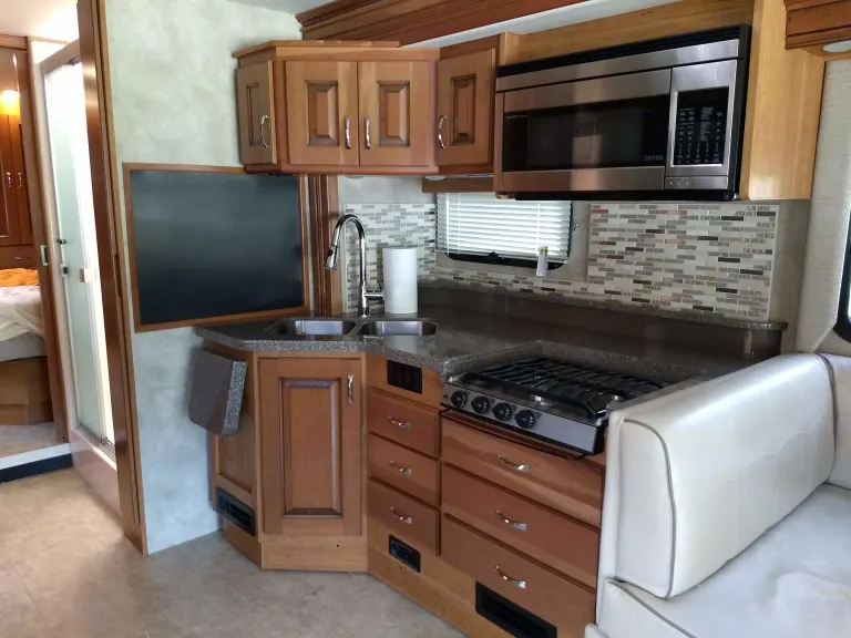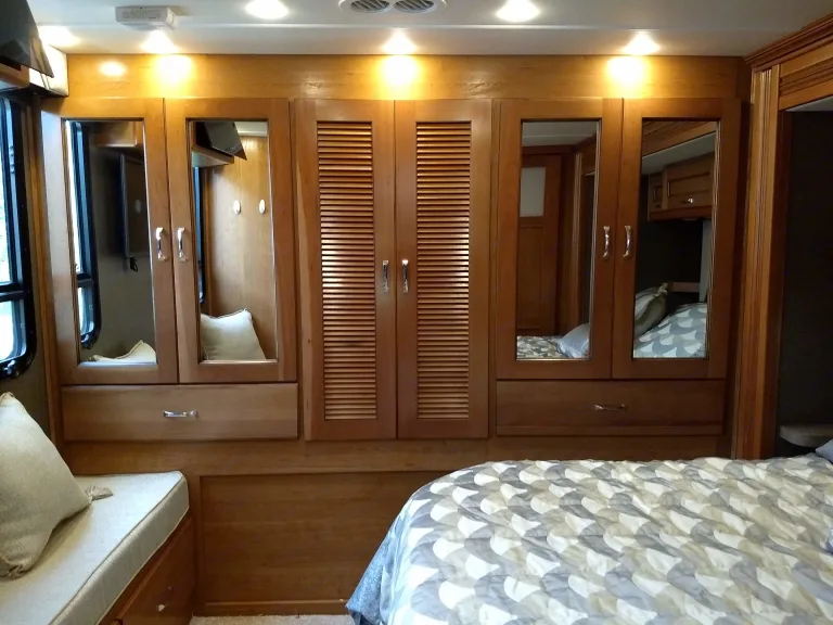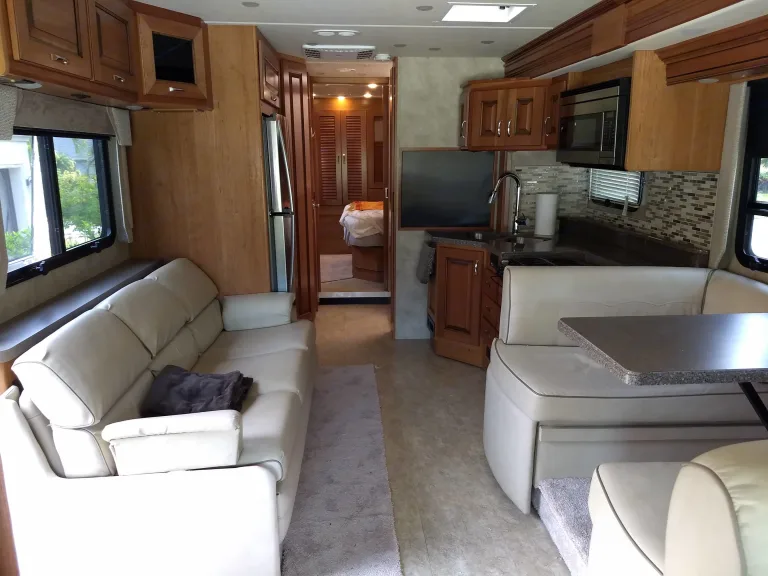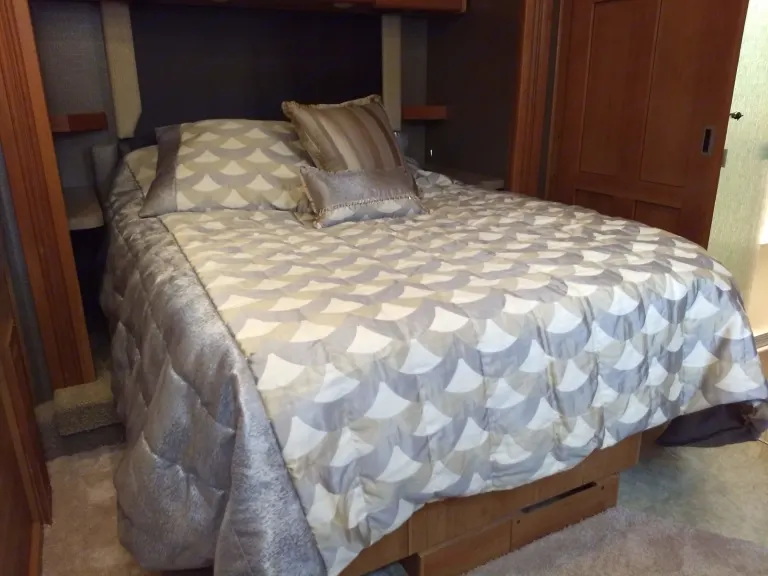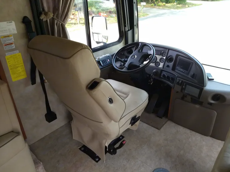 33 Diesel Pusher in perfect condition. Center kitchen with microwave/induction, stove, double sink, large refrigerator with top freezer, pantry. Comfortable dinette for 4 people. Sofa seats 3. Queen size bed over driver area (automatic retract). Passenger seat will recline for utmost comfort while driving.
