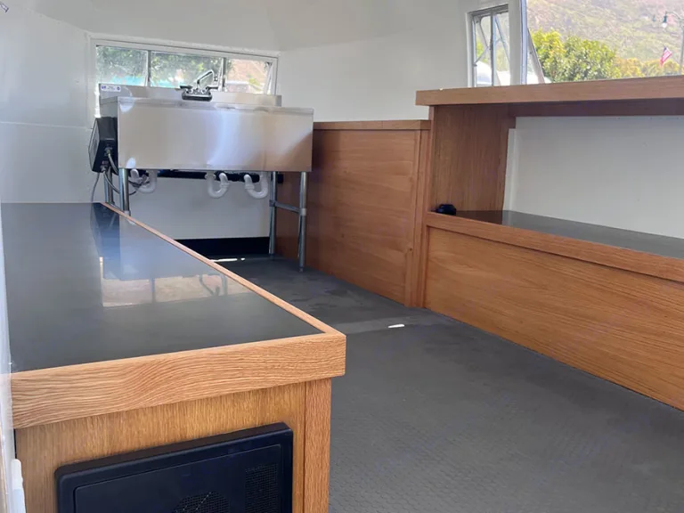 Mauna Loa is a BBQ trailer equipped with a 5 foot bbq and smoker for the gourmet cook, uses either wood or briquets. It has a service window, 3 basin sink, hot water heater for on demand hot water with 18 gal tank, storage space for coolers. It can operate as a bbq trailer also can operate as a pop up bar utilizing food or beverage service window