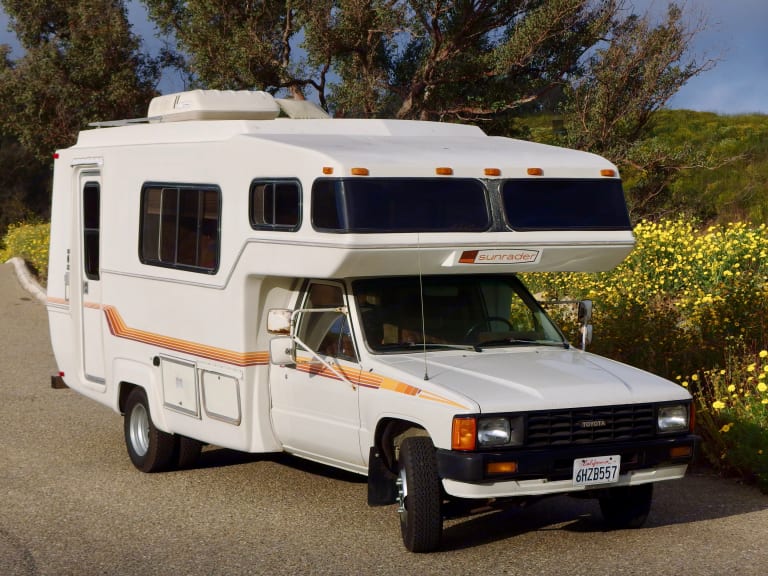 This is our Vintage Toyota Sunrader camper.It is easy to drive, fits in most regular parking spaces, get great gas mileage, and is Toyota reliable. It’s clocked just 98k miles since new and is now sporting fresh tires and upgraded brakes.Sunraders epitomized the very top of the line in Toyota campers. Solid fiberglass construction, big windows and clever design make them unique among the breed.We like this floor plan because it has the kitchen