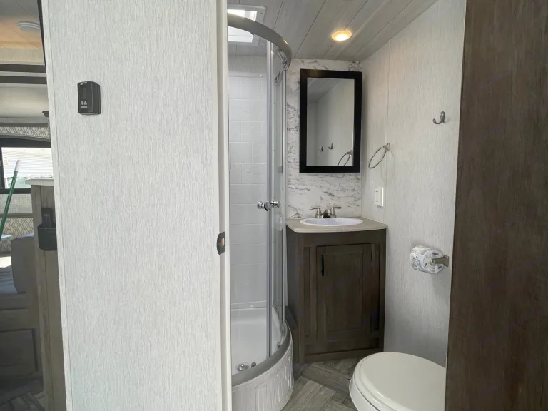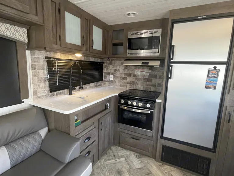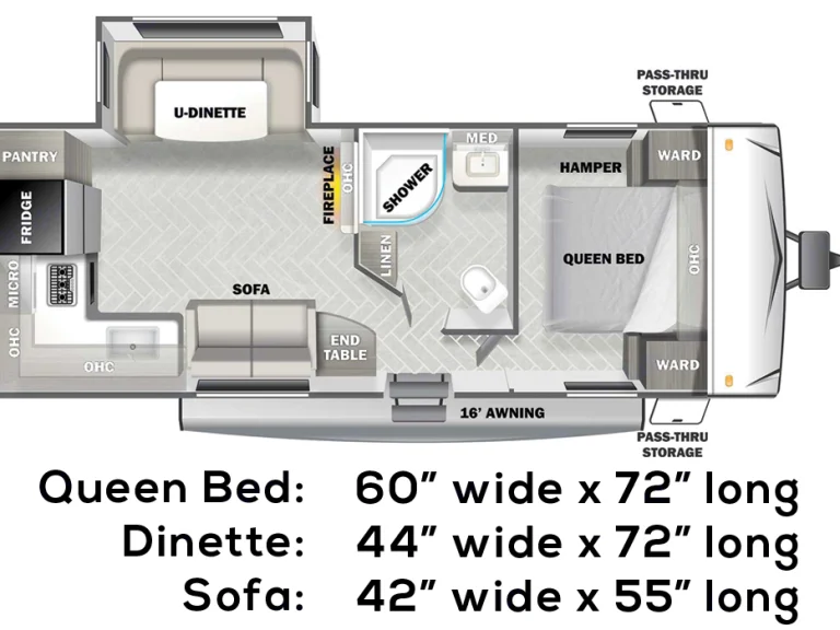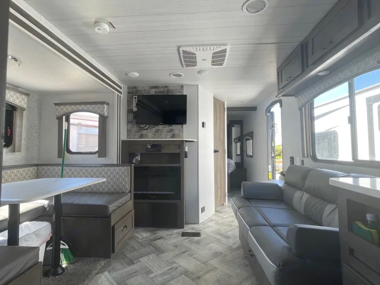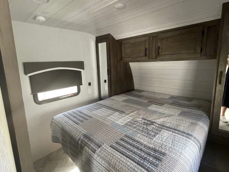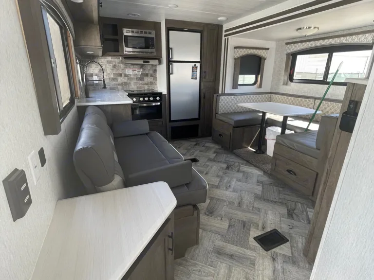 We only have 1 of this model available, available for delivery only. Sleeps 2 comfortably, up to 4 total. This is a 28 foot trailer with slide out. Private master bedroom with queen size bed, TV/DVD, A/C and furnace, electric awning, microwave and fireplace. The refrigerator operates off of propane or electric. Propane is included, but you will need a generator if you are in a non-hookup site. The sofa is short and will not sleep anyone over 5' tall.This trailer holds 56 gallons of fresh water. 2 grey water holding tanks for a total of 75 gallons & 1 black holding tank of 40 gallons. If you are at a non-hookup site and will be camping for more than a few days, we would recommend looking at our model T2550 trailers that have greater tank capacities.Our trailers come with essential kitchen items such as a pot, pan and coffee maker, but they do NOT include: pillows, linens, towels, plates, bowls, cups or utensils. Complete inventory and suggested packing lists are provided with reservation confirmation or can be found in our FAQ section.Please review the 'Enhance Your Trip' section below for delivery locations, generator add-ons, and pet fee.