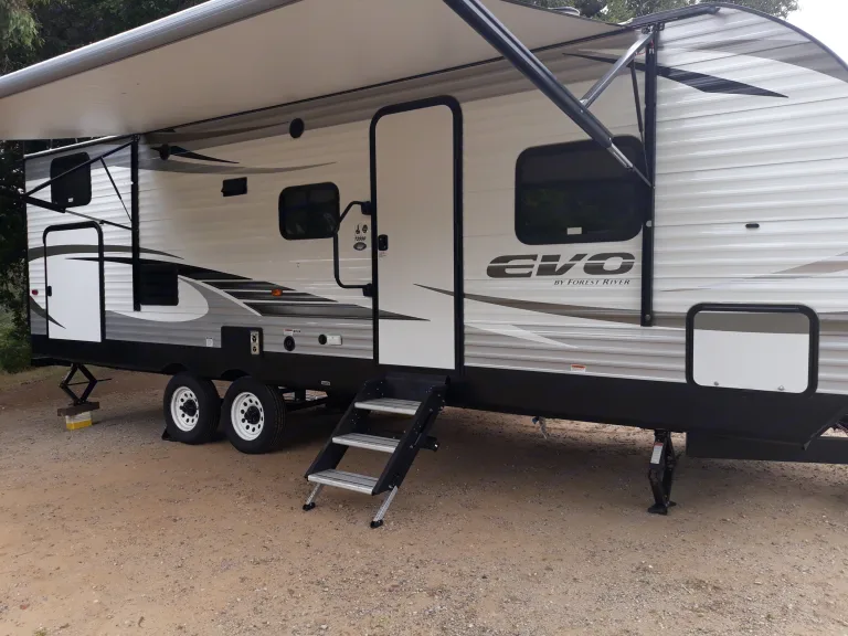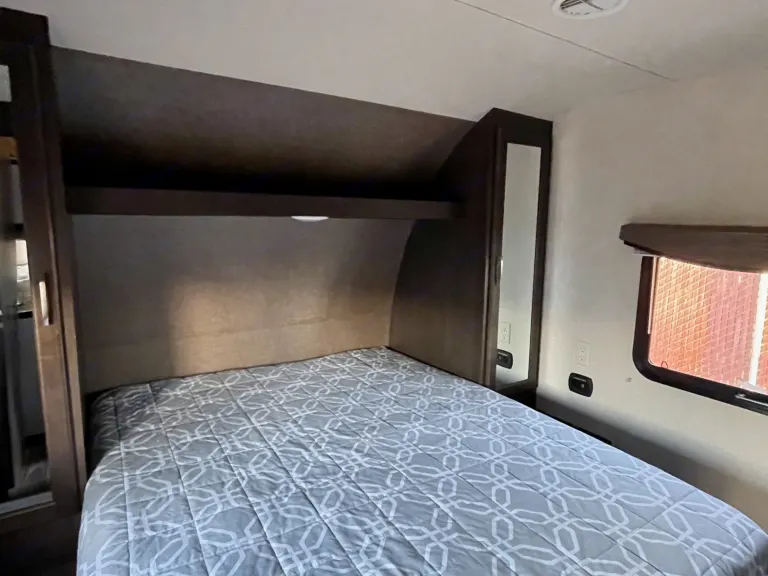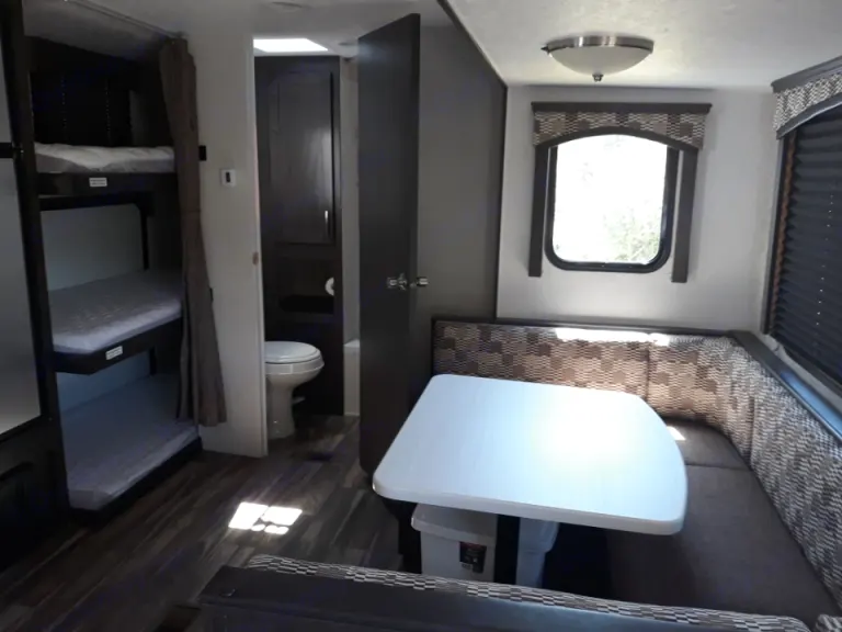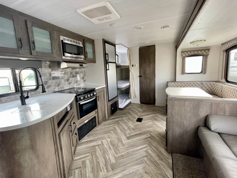 We have 6 of this model available for delivery only. Sleeps 5 comfortably, up to 7. This is a 30 foot trailer with slide out which makes the living room area nice and big. It has a private master bedroom with a Queen size bed. Triple bunks with twin size beds in the rear, TV/DVD, A/C and furnace, electric awning, and microwave. The refrigerator operates off of propane or electric. Propane is included. Solar equipped, but you will still need a generator if you are in a non-hookup site.**This is the only model that holds over 100 gallons of Fresh Water ** 2 grey water holding tanks for a total of 75 gallons & 1 black holding tank of 40 gallons. The additional fresh water and solar make this model ideal for non-hookup RV Camp sites.Our trailers come with essential kitchen items such as a pot, pan and coffee maker, but they do NOT include: pillows, linens, towels, plates, bowls, cups or utensils. Complete inventory and suggested packing lists are provided with reservation confirmation or can be found in our FAQ section.Please review the 'Enhance Your Trip' section below for delivery locations, generator add-ons, and pet fee.