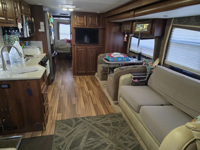 This is a delivery-only rental. I will deliver it to your campsite, set it up, show you how to use it, and pick it up when your rental is over. You will not have the ignition key. I do not deliver or pick up on Sundays. If you schedule your campsite for Fri-Sat-Sun ensure they know the RV will be picked up on Monday from the campsite. This means you will likely have to pay for the campsite for Sunday night. The RV nightly rental rate takes into account you may depart on Sunday but the RV will stay at the campsite until I pick up on Monday.The water and propane tanks will be full when I deliver. The gas tank will be near full (the generator uses the gas in the tank).There is a queen-size bed in the back (main) bedroom. The sofa and dining table fold down for use as beds. The over-cab bunk is a great place for putting things or to use for sleeping. The over-cab bunk supports 200 pounds. If you plan on putting people up there to sleep know there is no retaining strap to keep them from rolling off. The RV easily sleeps 7 adults (note over-cab weight limit).With two slide-outs there is plenty of room inside the RV. With a power retractable awning outside there is plenty of covered patio space available.With a full-size, three-door, residential refrigerator/freezer there is plenty of space for cold and frozen food to feed you, your family, and your guests. Overhead cabinets provide additional storage for non-perishable items as well.A 50-gallon freshwater holding tank and 6-gallon hot water tank give you plenty of water if your campsite has no water connection. The refrigerator and freezer run on electricity only. The hot water heater and stove run on propane. The microwave is electric. There is plenty of room in the shower for an adult to take a comfortable shower.This is a 50 amp RV. The onboard generator fires right up and provides ample power if you are staying where there are no 50 amp electrical connections.Roof vents have covers so you can keep them open during a rainstorm. The two A/Cs work great if the open vents and screened windows are not sufficient.We've used our RV in the winter months in South Dakota. The heater works well. We keep the inside temperature set at about 70 degrees. If it's going to be cold where you're camping we can include some additional portable electric heaters.Well-behaved pets welcome. We've traveled and camped with 4 cats and a Yorkie. They all find "their" spot.There are two TVs in the RV; one in the living room and one in the back bedroom. Each bunk has its own small TV too. But hey, you're out to have fun not watch TV. What's includedPlease bring your own bed linens (or sleeping bags), pillows, and bath towels. These items are not provided. Also, you provide your food and drinks.Plates, bowls, cups, utensils, cookware, and microwave dishes are included. These are not for cooking over a campfire.Toilet paper comes with the RV. Sewer and water hoses are included. In-line water filter for water hose included.Plan on about one hour at delivery and 30 minutes at pick up to go over everything. RecommendationsThe Lewis and Clark State Park, Cottonwood Campground, and the Chief White Crane Recreation Area are great parks in the local area.