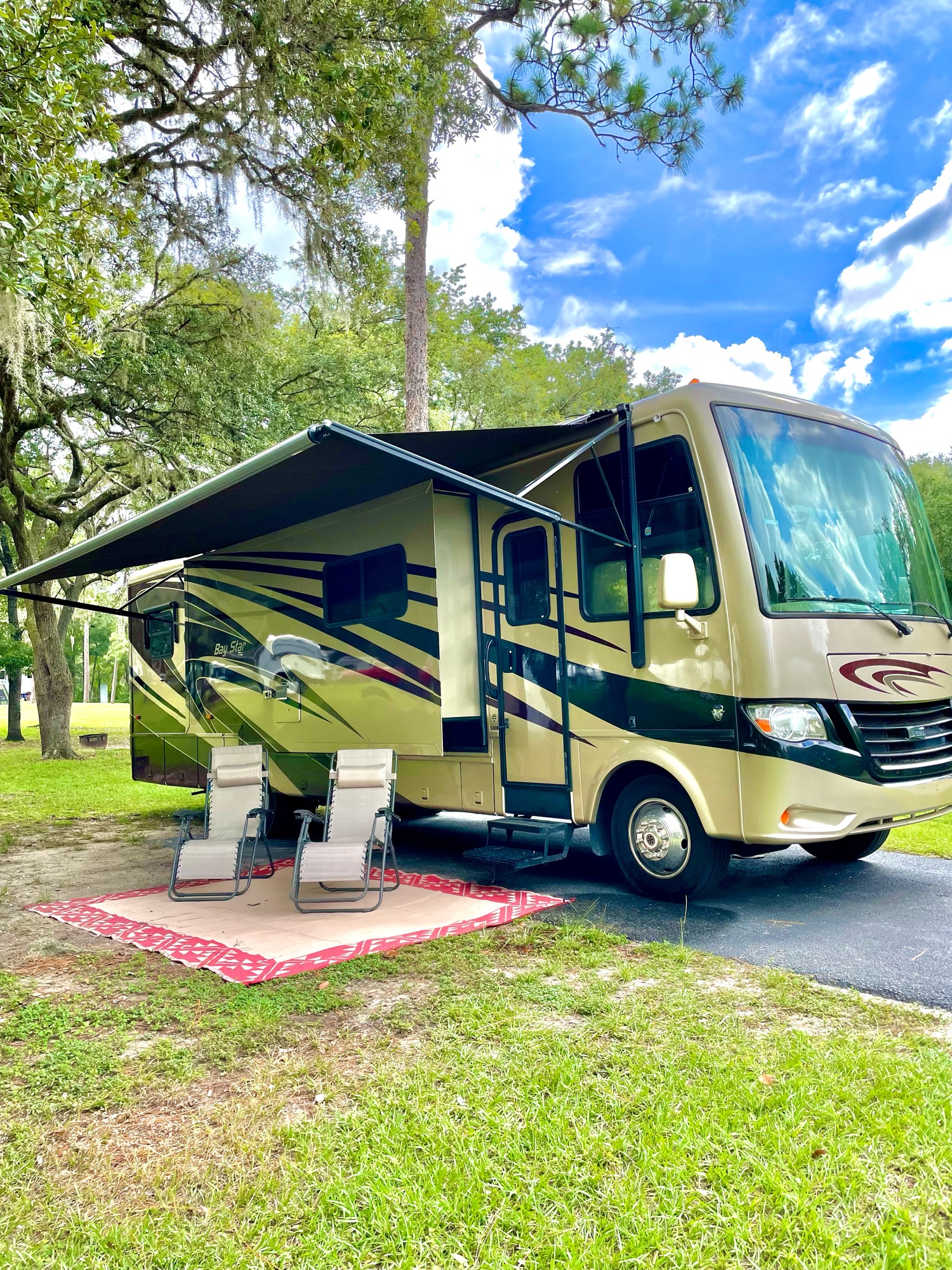 Bay Star Babe is a beauty. Hard wood throughout, plush furnishings, ice cold air conditioning plus 3 slide outs that gives you the room and comfort just like home. She’s loading with all your cooking utensils, pots and pans . She’s clean inside and out with fresh linens for your comfort as well. Propane grill, folding table and chairs. Cleaning supplies soap and dish soap. Ventilation for cabin and shower humidity and black out blinds for your privacy. Plenty of storage. I will only rent to those who commits to taking great care of her. Thanks What's includedCoffee pot and all basic essentials are already provided. Only use RV toilet paper in bathroom. Absolutely No SMokiNG! 3 televisions and foBluetooth stereo for your enjoyment. New tires and well maintained she is all that! I will consider pet dogs considering the age and breed. This is not a party bus !RecommendationsLet out the awning and put out the table and chairs for a relaxing evening by the beach. Other things to noteNo towing trucks, no party bus, NO SMOKING,NO ANIMALS, No unauthorized driving. Pull driver seat forward before slide out with couch for maximum space.
