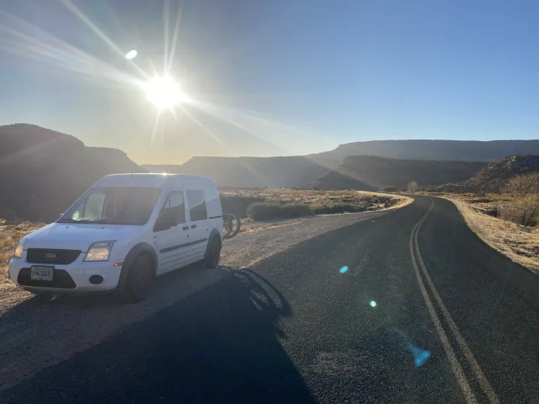 This is our beloved Ford Transit Connect that we have turned into a camper/adventure van. Ford Transit Connects are known for their versatility, low gas mileage, and small foot print. This is an easy drive that feels like a regular sized car, and is incognito (fitting in any size parking space!) It is simply set up to allow for an easeful, yet comfortable road trip or camping excursion for two. One of our favorite features is the large windshield that provides sweeping panoramic views, don't overlook this adventuremobile!There is a full sized bed in the back that is very cozy with blankets, pillows and sheets included. There is a kitchen box that slides out under the bed. There is a large storage compartment for clothes and shoes. Additionally, there is extra storage under the bed for any other gear you want to bring along. There are black out windows that keep the van cool during the day and warm at night, and a privacy curtain in the front. What's includedKitchen Box: