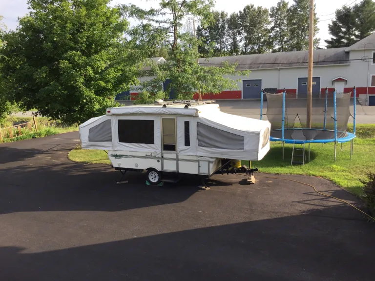 10 pied de plancher +coffre avant et int. Banquette full largeur par dessus coffre int.Porte velo 5 places.Eau au robinet intérieur ne fonctionne pas. Toile neuve .ovant de 10x8