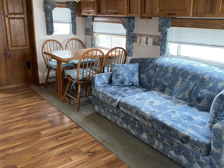 A warm, roomy and comfortable camper great for short excursions or week long family trips. Free standing dining table and couch makes for flexibility in the layout. Upgraded 10” pillow top mattress in the main bedroom for a good nights rest after being out in the fresh air all day. Camper has a 27” TV for when the weather gets wet outside.