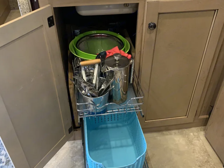 -Spacious living area with opposing double slideouts.-Compartment in the rear of the RV is large enough to hold full size bicycles and plenty of camping gear.