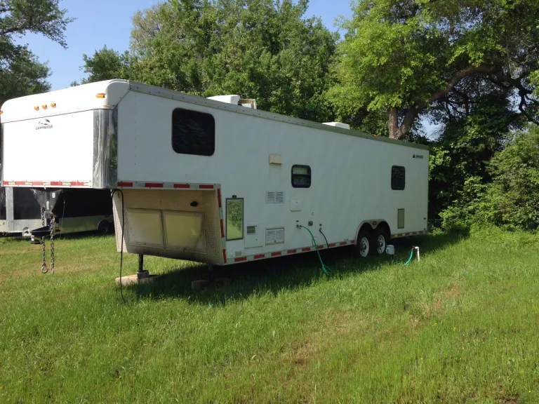 This Toy hauler has a 13' garage with drop down ramp, perfect for a ATV or Golf cart while still having room for bicycles, coolers, etc. The front sleeping area has a residential queen mattress. Dinette makes into a bed for a total sleeping capacity of 4. Fresh, gray, and black water tanks. Micro/convection, cooktop, fridge, water heater, dual propane tanks. Bathroom has small sink area, shower, and toilet. Note this is a gooseneck not a 5th wheel. It will require a 2 5/16 gooseneck ball